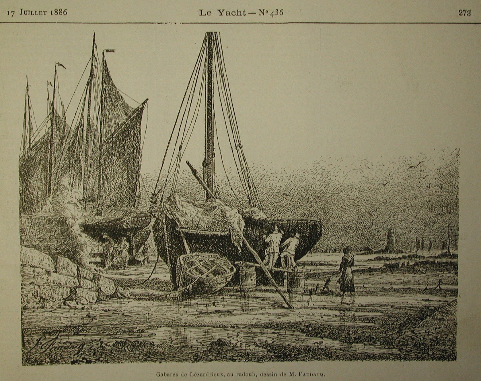 Gabarres échouées dans le Trieux, dessin gravure Le Yacht 1886, FaudacqImmatriculation