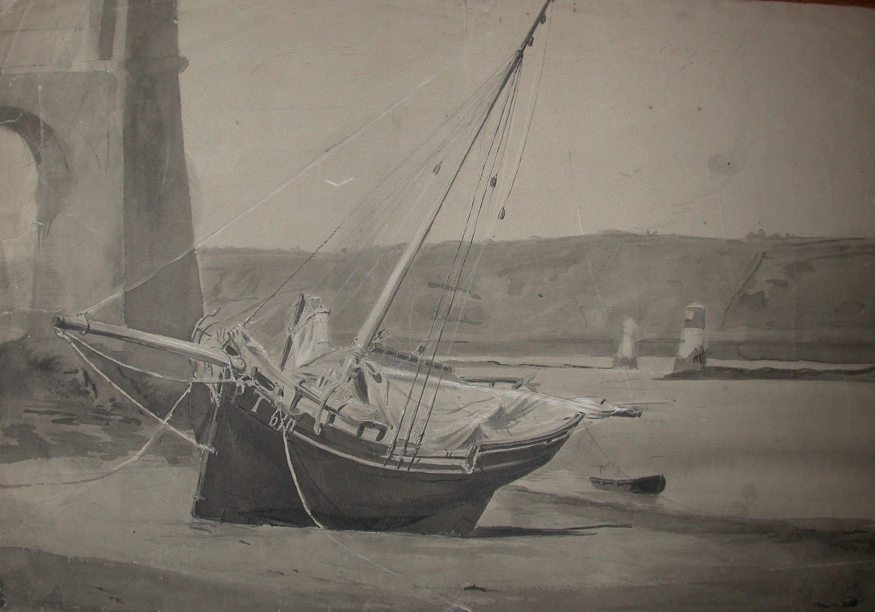 Gabarre à l’échouage sous l’ancien pont de Lézardrieux, Faudacq, fin 19ème siècle,lavisImmatriculation
