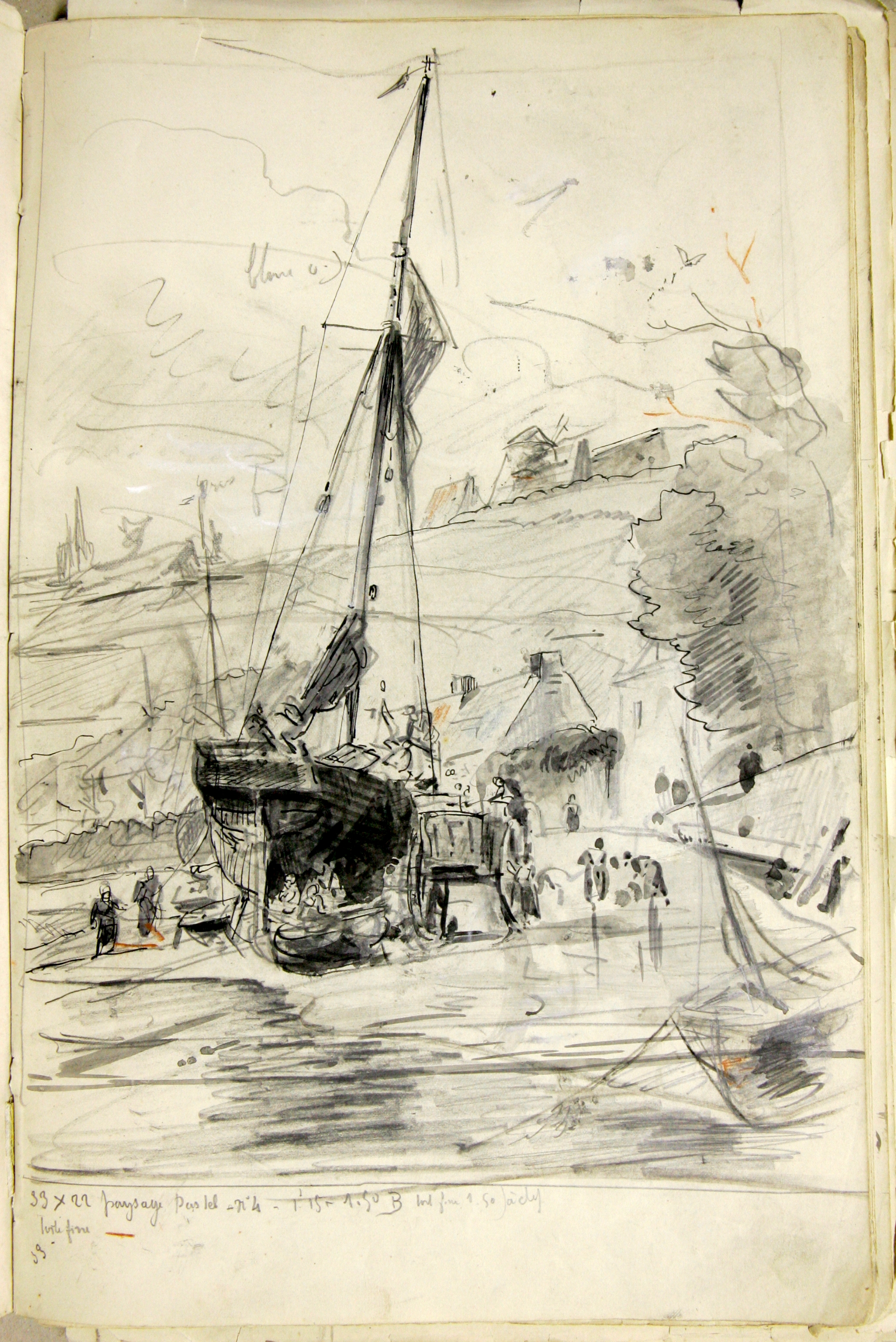 Déchargement au port de Lézardrieux. Remarquer le moulin de Lan Goc, dessin aquarellé, extrait du carnet de FaudacqImmatriculation