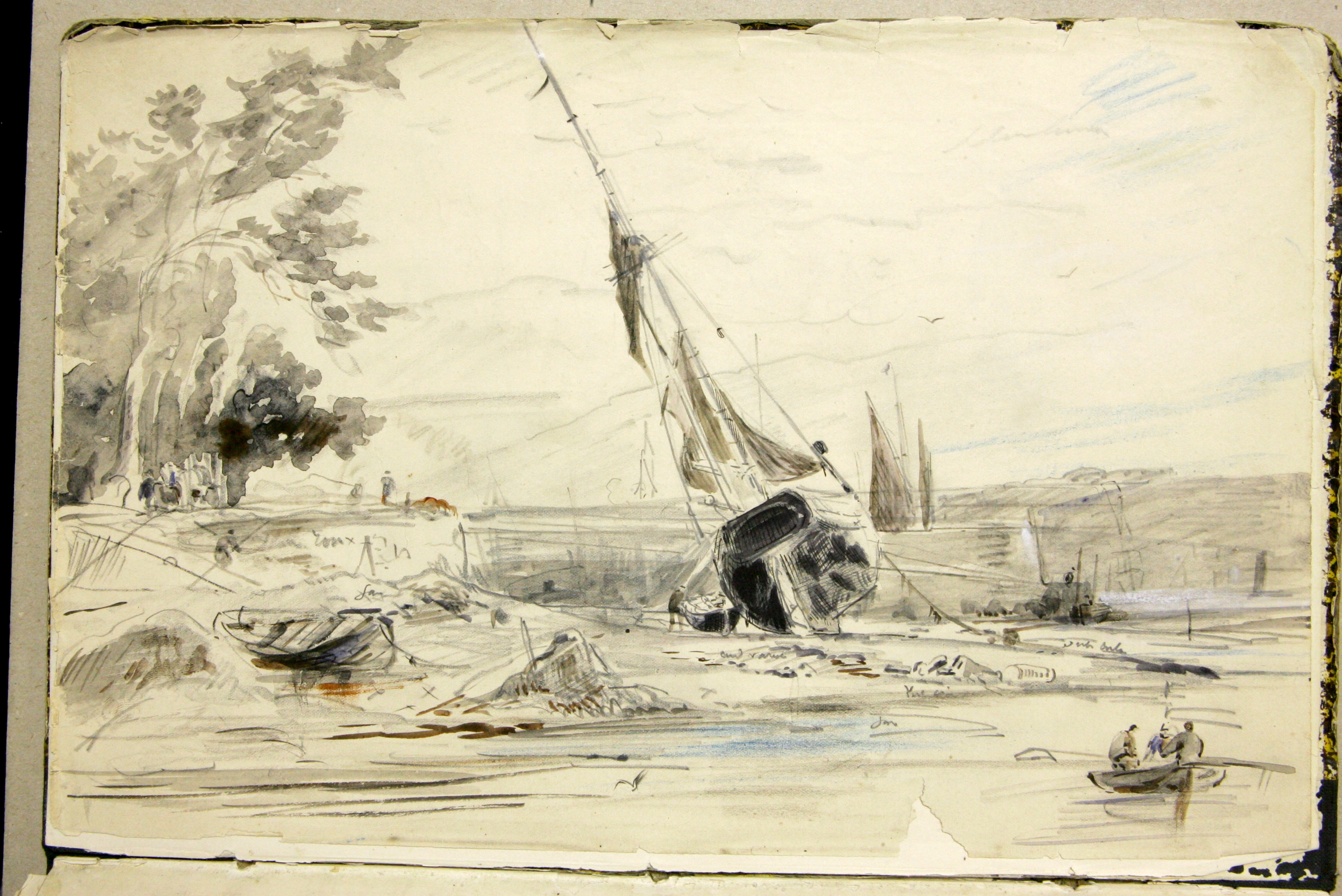 Grand sloop à l’échouage au port de Lézardrieux, dessin aquarellé, FaudacqImmatriculation