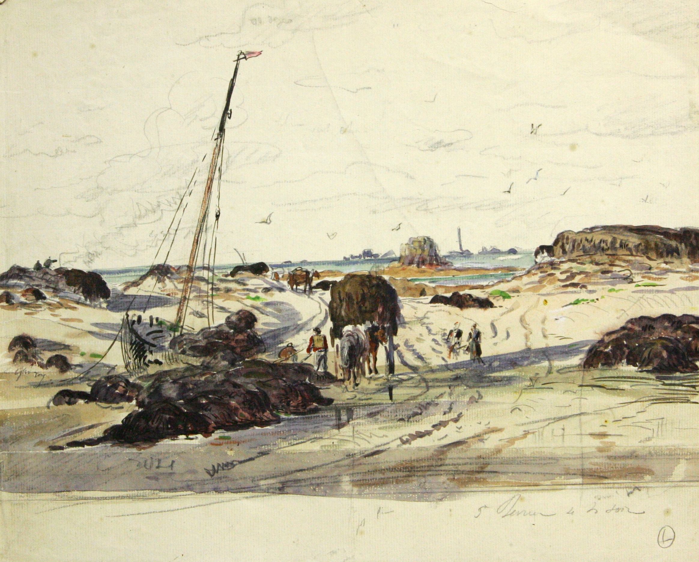 Echouage de bateaux goémoniers dans la petite grève du Sillon de Talbert et sur la dune de sable, fin 19ème siècle (Dessin aquarellé, Faudacq)Immatriculation