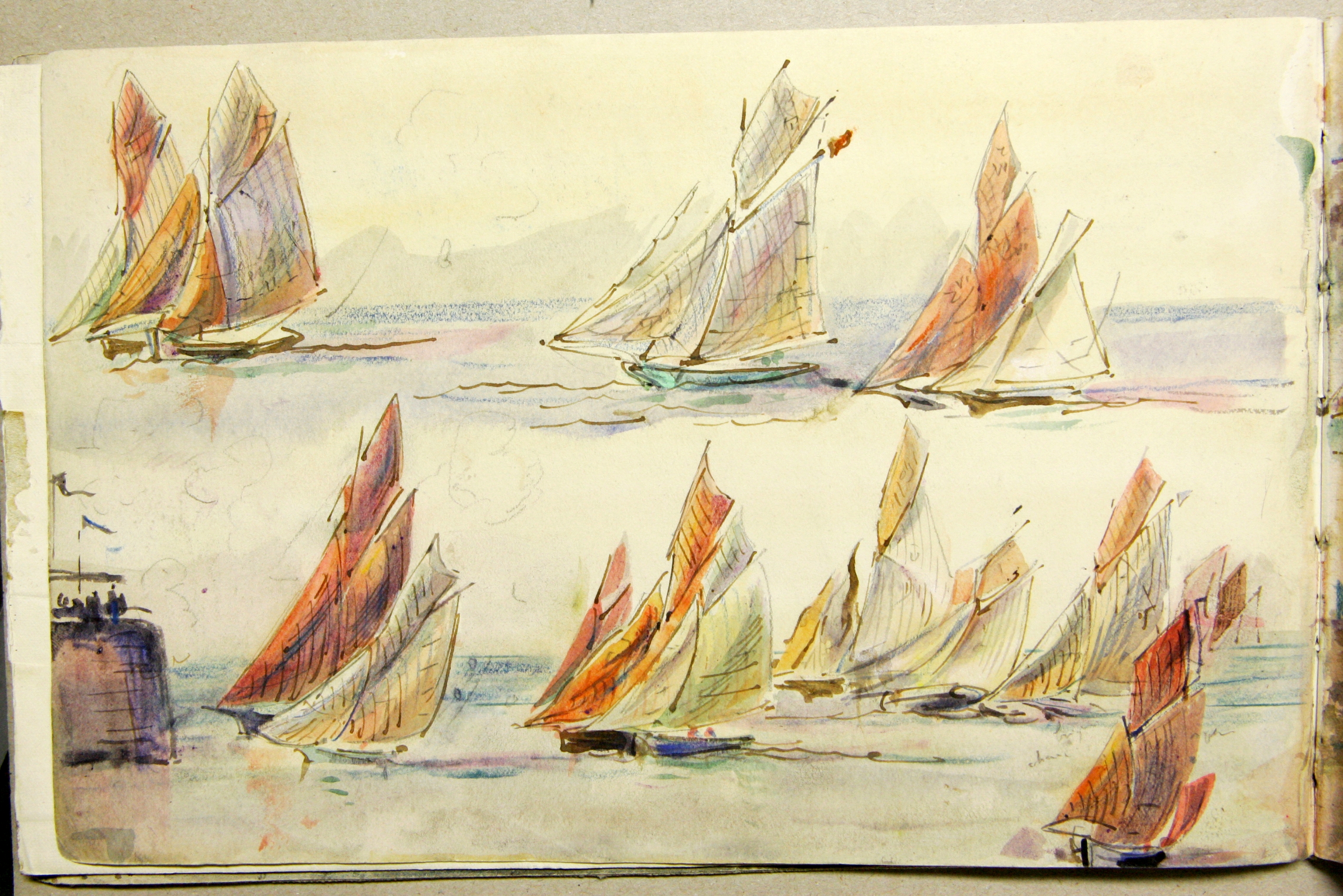 Sloops avec “tout dessus” dont le flèche, en régate, dessin aquarellé (Faudacq)Immatriculation