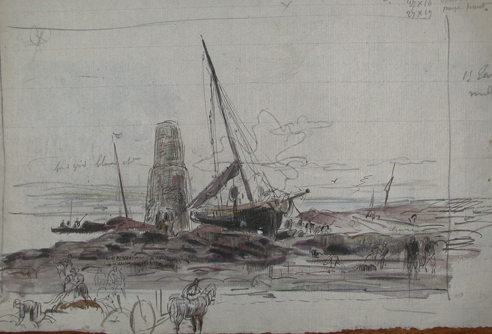 Dessin aquarellé : gabarre échouée pour la coupe et le transport des goémons (Faudacq)Immatriculation