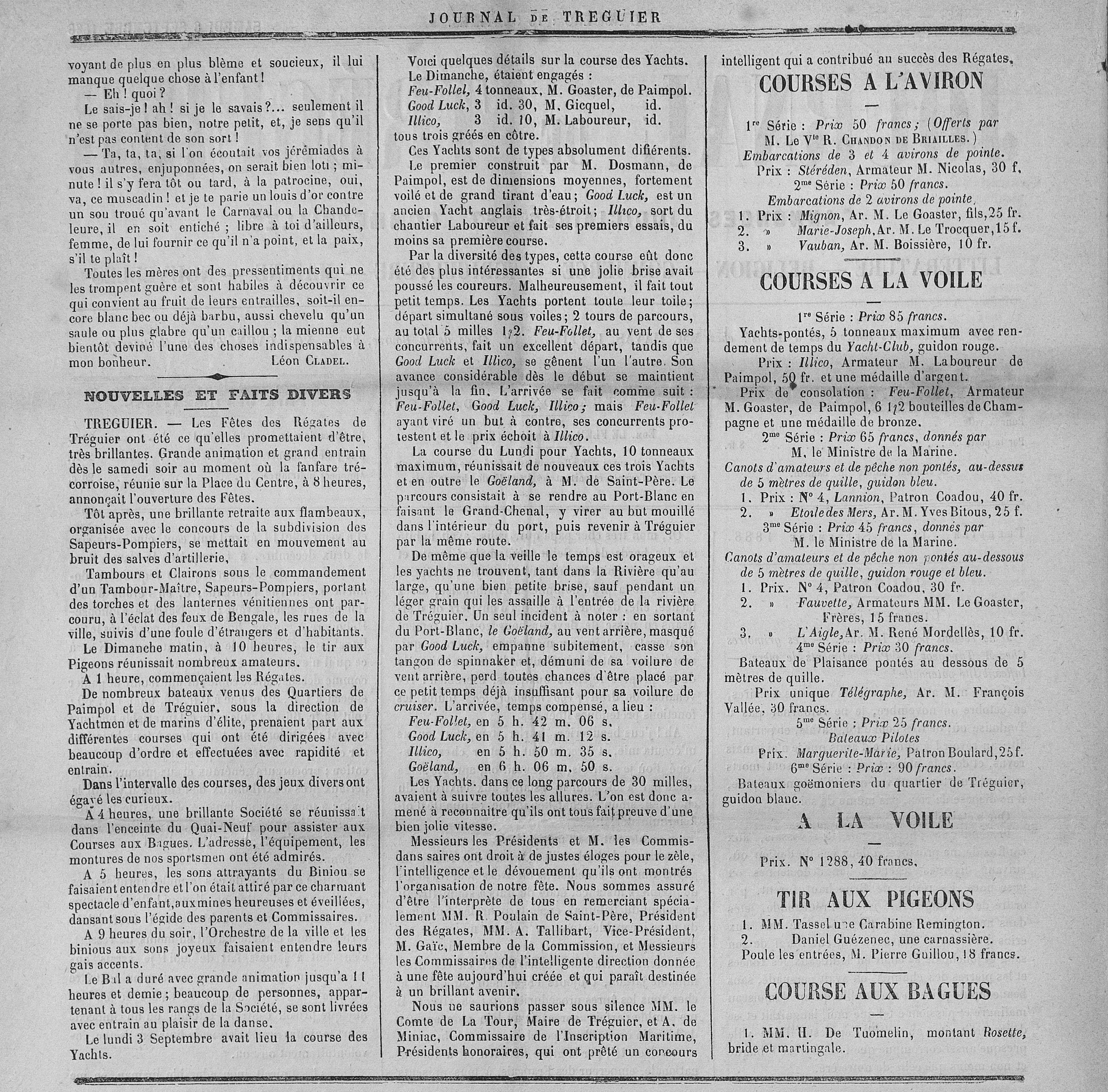 2 septembre 1888, page de l’hebdomadaire "Le journal de Tréguier" relatant les résultats des régates de Tréguier (Archives Départementales des Côtes-d’Armor, cote JP 54)Immatriculation
