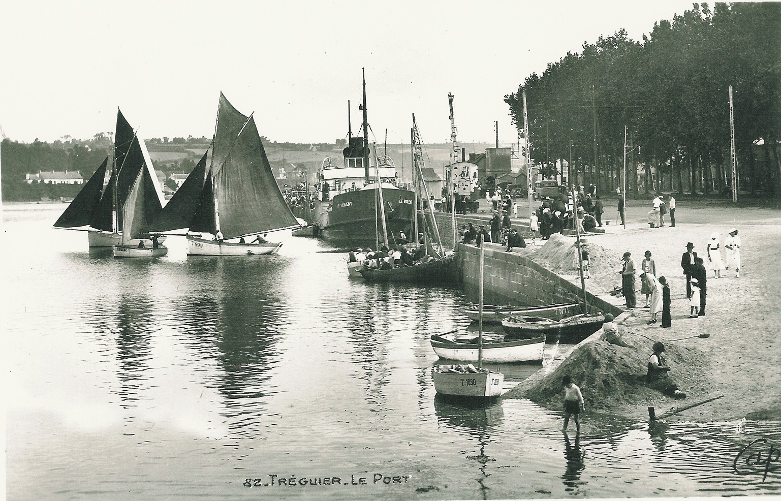 Jour de régates dans les années 1930, départ de 2 cotres du grand quai où est accosté un vapeur, les grues du chantier Guézenec ont été électrifiées, carte postale (collection particulière)Immatriculation
