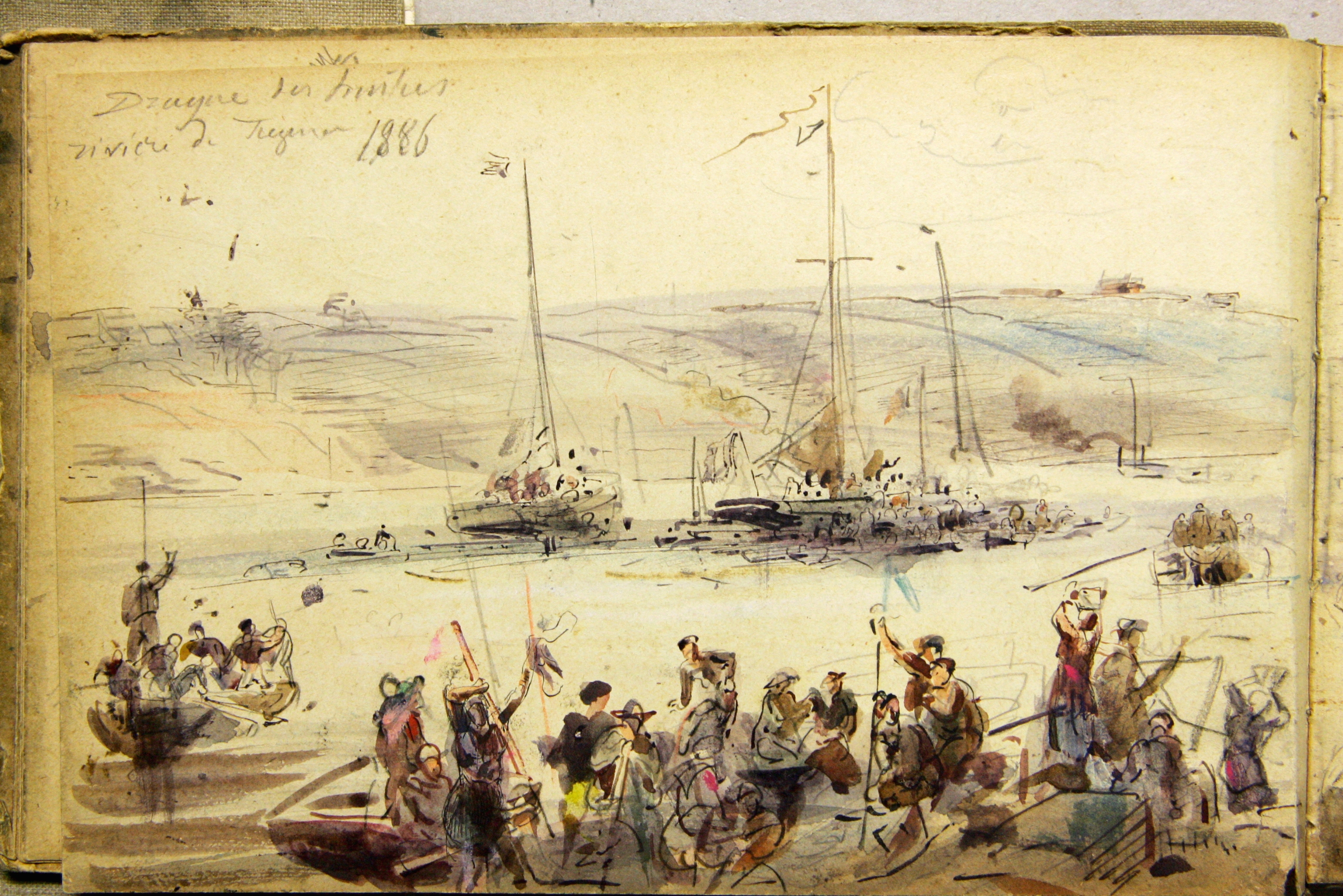 Dessin aquarellé de Louis-Marie Faudacq, 1886 : la pêche aux huîtres en rivière de Tréguier, en amont et en aval du port (extraits carnets de dessins, Faudacq, collection particulière)Immatriculation