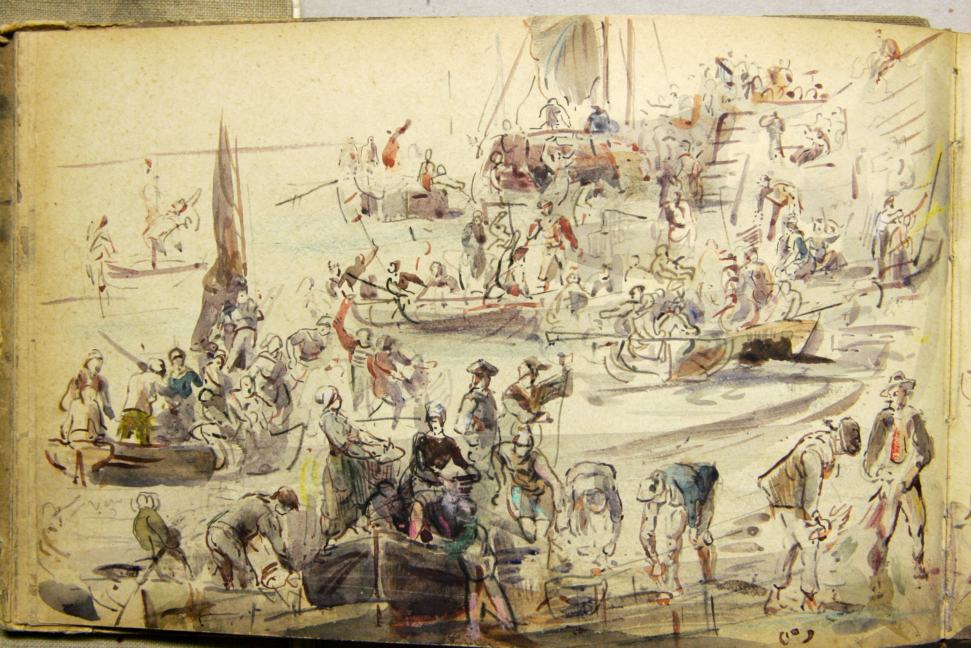 Dessin aquarellé de Louis-Marie Faudacq, fin 19e siècle : la pêche aux huîtres en rivière de Tréguier, en amont et en aval du port (extraits carnets de dessins, Faudacq, collection particulière)Immatriculation