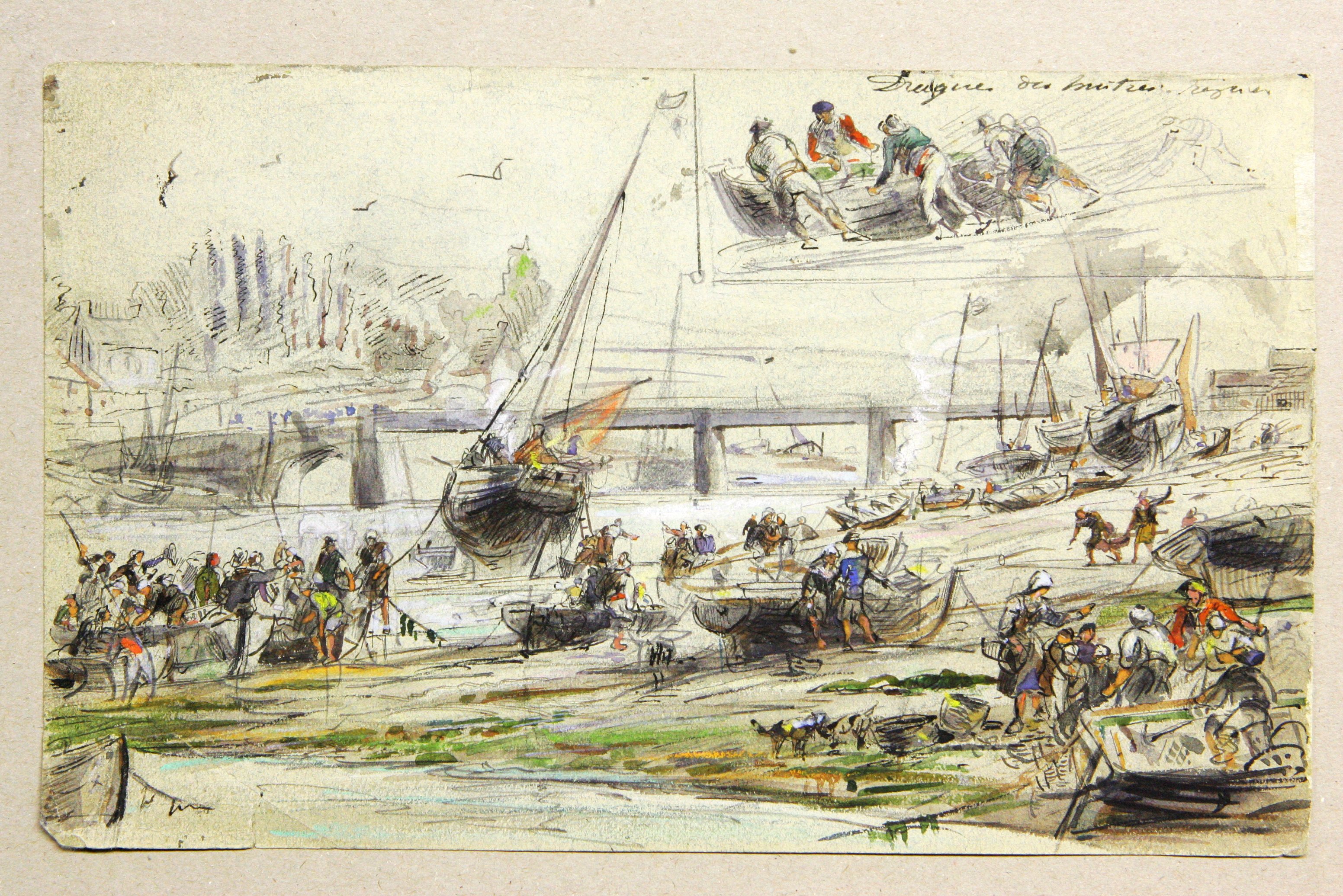 Dessin aquarellé de Louis-Marie Faudacq, fin 19e siècle : la pêche aux huîtres en rivière de Tréguier, en amont et en aval du port (extraits carnets de dessins, Faudacq, collection particulière)Immatriculation