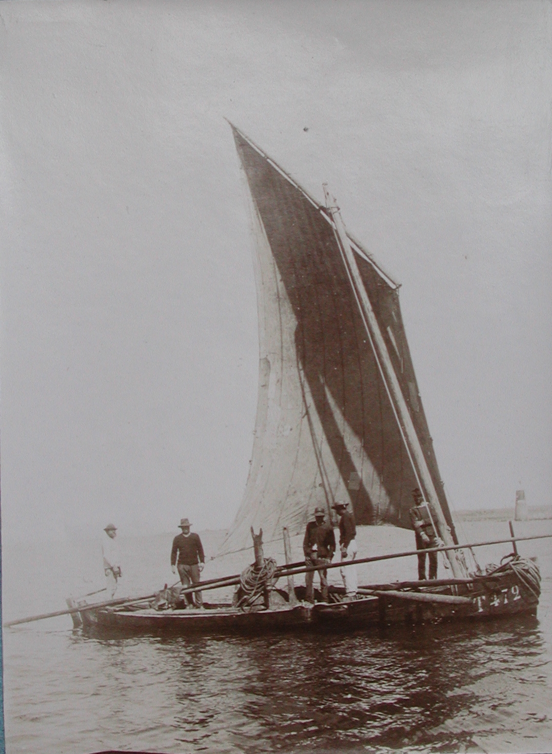 Bateau sablier à cul pointu de la Rivière de Tréguier devant le phare de la Corne, avec leurs dragues à poche (Faudacq)Immatriculation