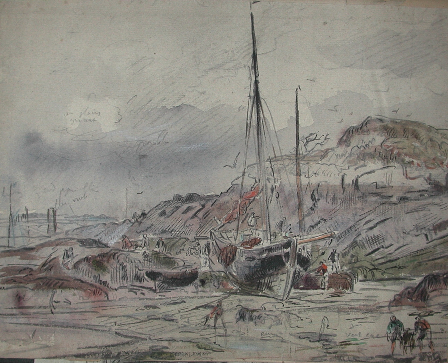 Scène de chargement de goémon d’échouage et de coupe en amont de la rivière, dessin aquarellé Faudacq, fin 19ème siècleImmatriculation