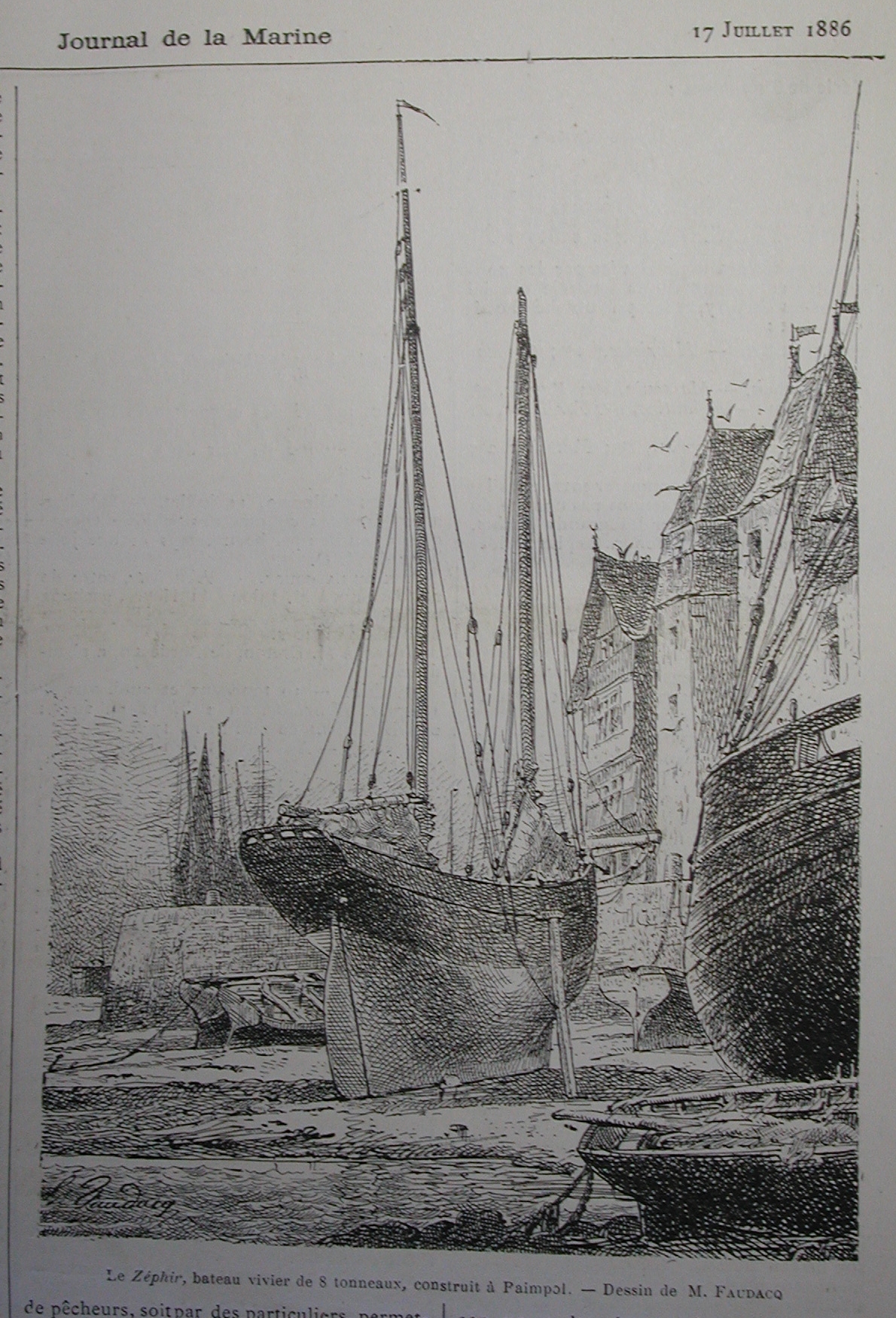 Le Zéphir, bateau vivier devant les quais de Tréguier, dessin gravure de Faudacq, Le Yacht 1886 (Faudacq)Immatriculation