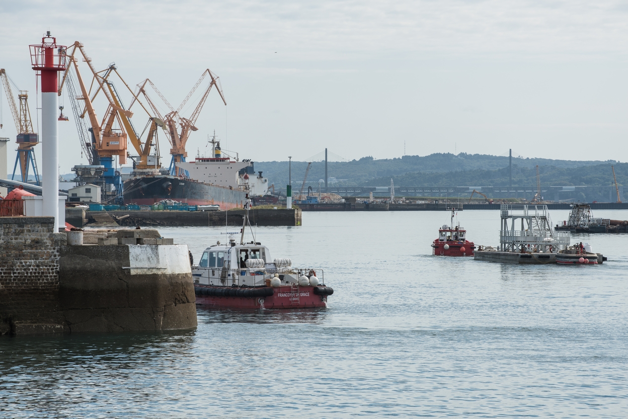 Chenal du port de Brest, passe Ouest : Grues du quai minéralier et des quais de réparation (2018, OPP port de Brest)Immatriculation