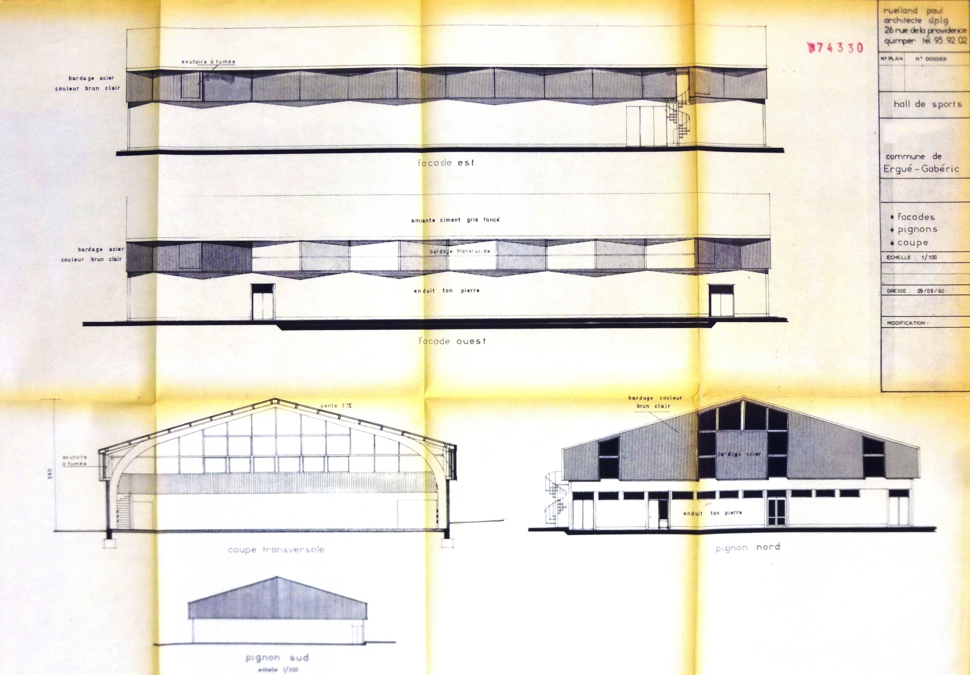 AC Ergué-Gabéric : non coté. Halle de sports : façades-pignons-coupe. P. Ruelland, 1980.