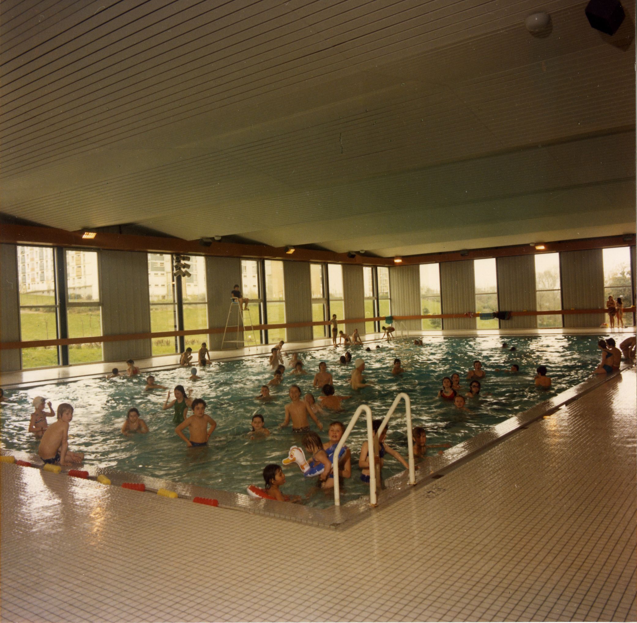 AC Brest : 2 Fi 869. Piscine municipale de Kerhallet rue du Maine. Bassin : vue intérieure. 1975.