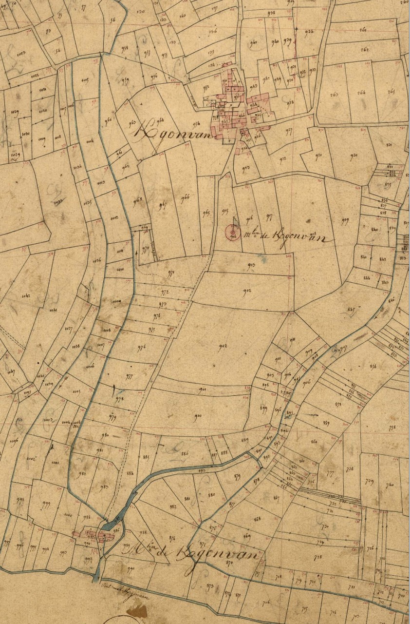 Moulins de Kergonvan, extrait du cadastre ancien de la commune de Goulien, 1836.Immatriculation