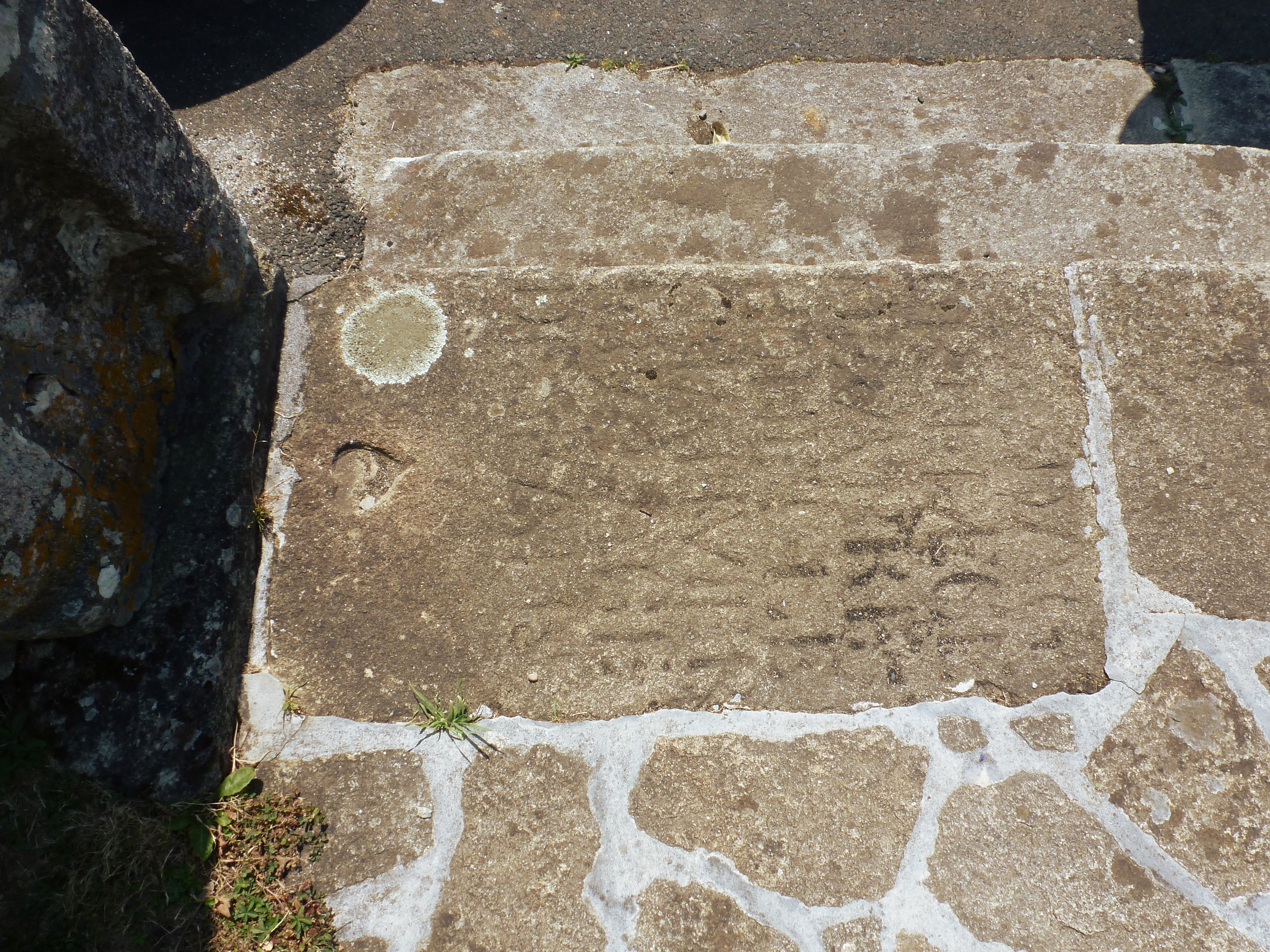Entrée de l'enclos, côté sud, pierre tombale de réemploi. (2018)Immatriculation