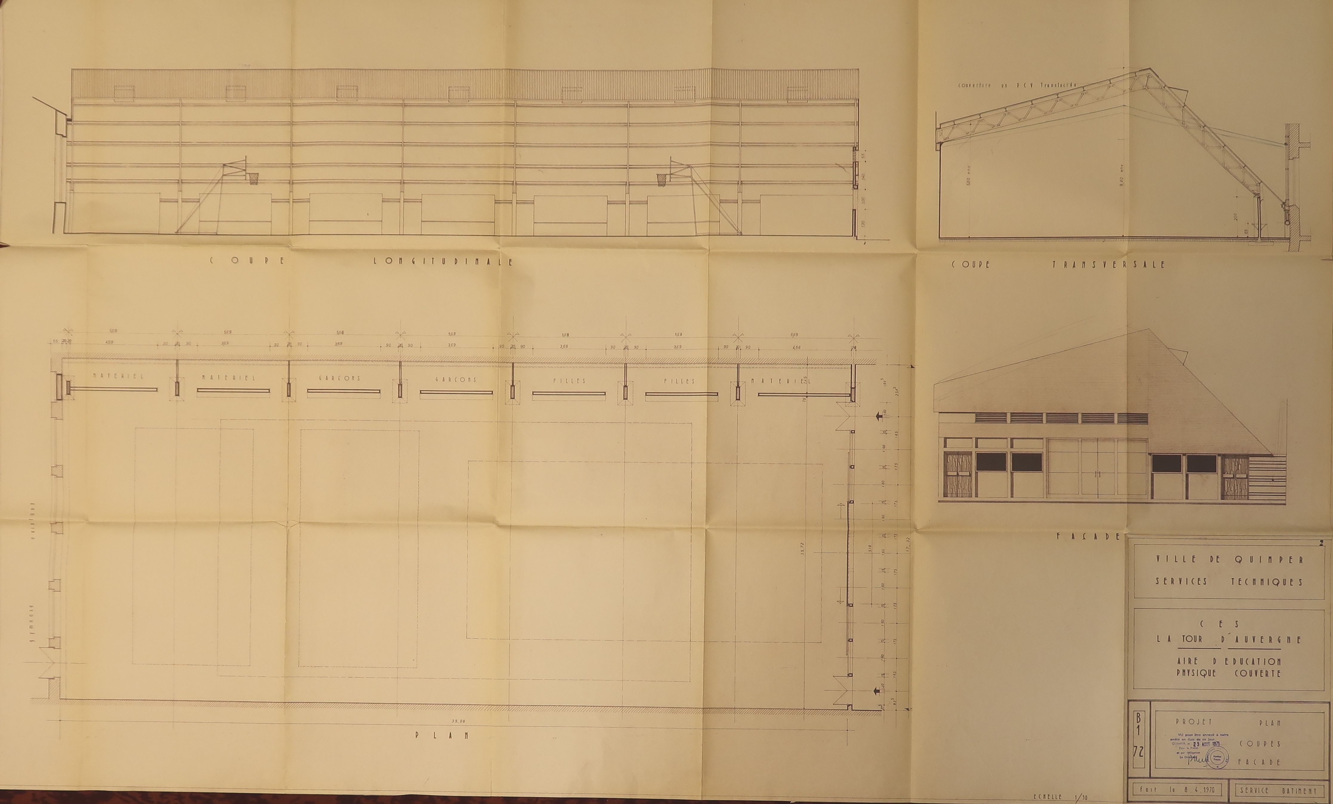 AC Quimper : 1078 W 138. Projet d'une aire d'éducation physique couverte. Services techniques de la ville, 1970.