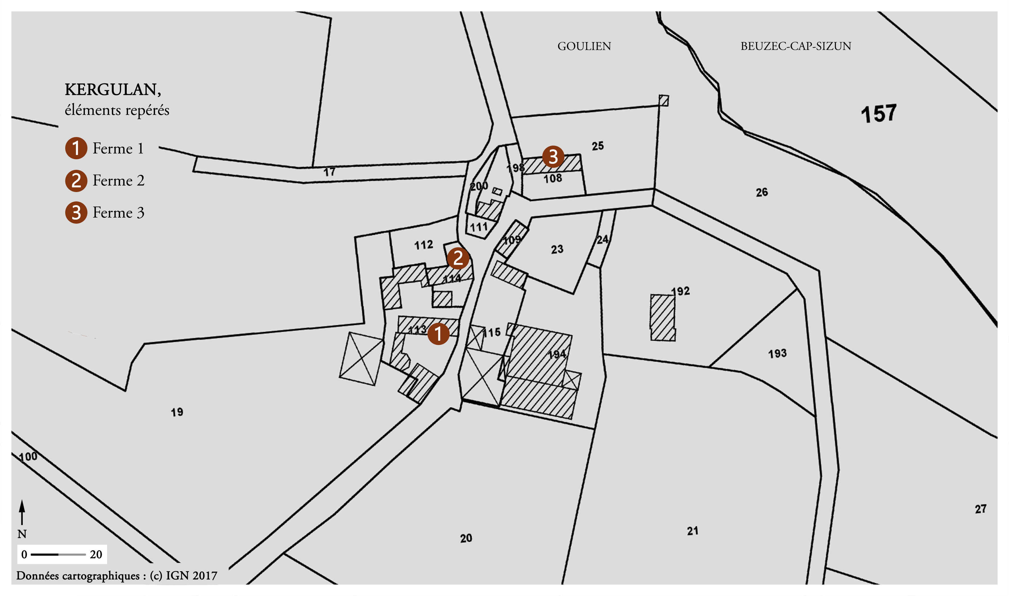 Village de Kergulan, éléments repérés, fond : cadastre 2017.Immatriculation