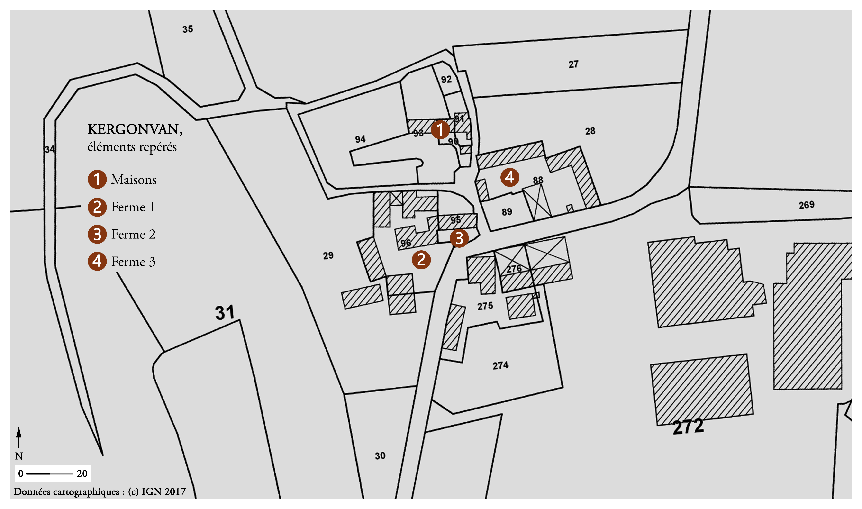 Village de Kergonvan, éléments repérés, fond : cadastre 2017.Immatriculation