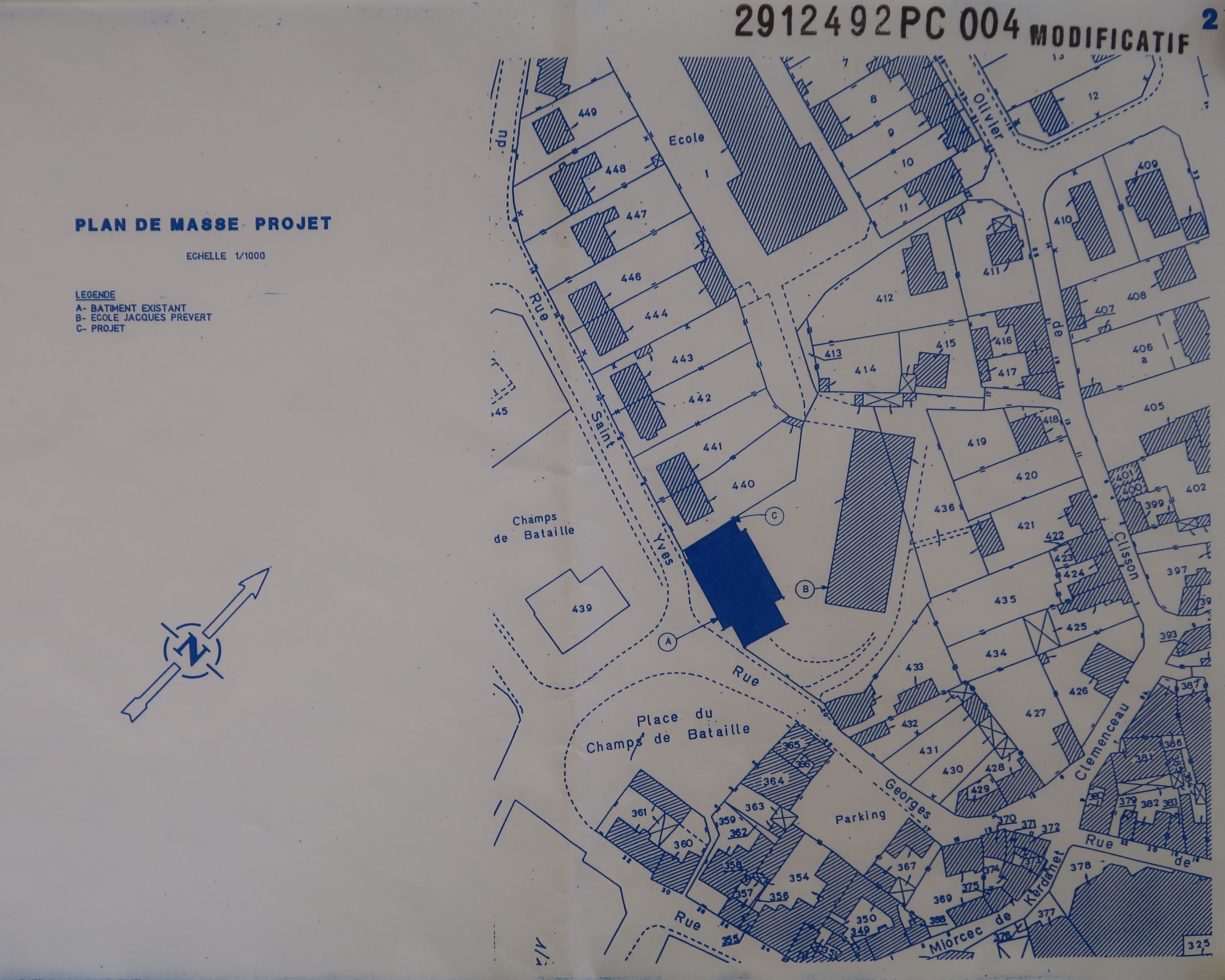 AC Lesneven : PC n° 2912492K0004. Plan de masse. Y. Jacq, 1992.