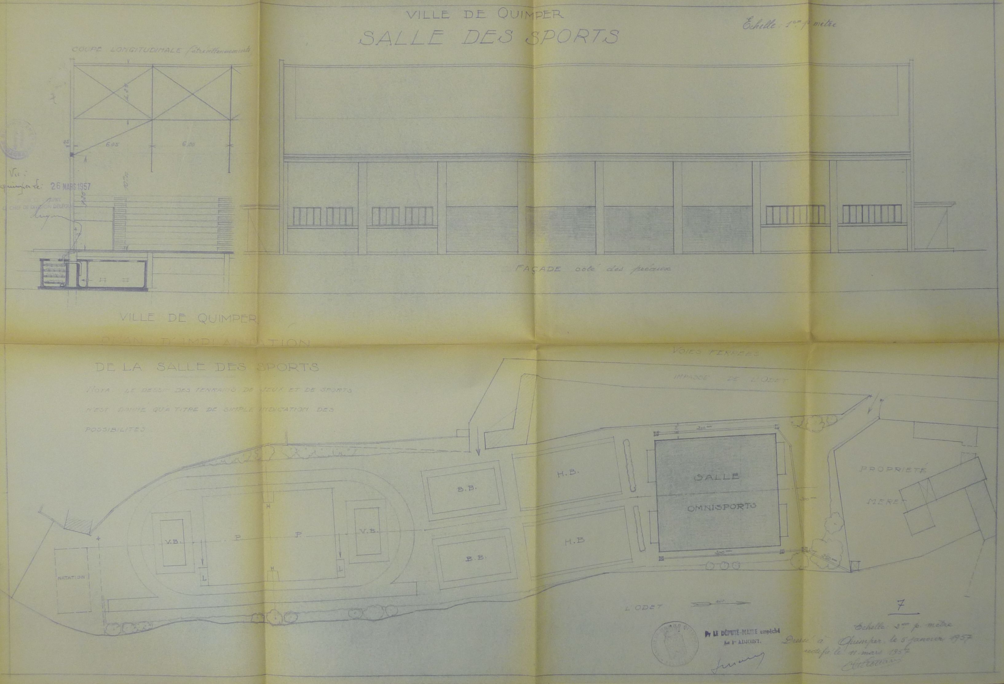 AC Quimper : 43 M_QUI 5. Plan masse, coupe longitudinale et façade côté des préaux. C. Louarn, 1957.