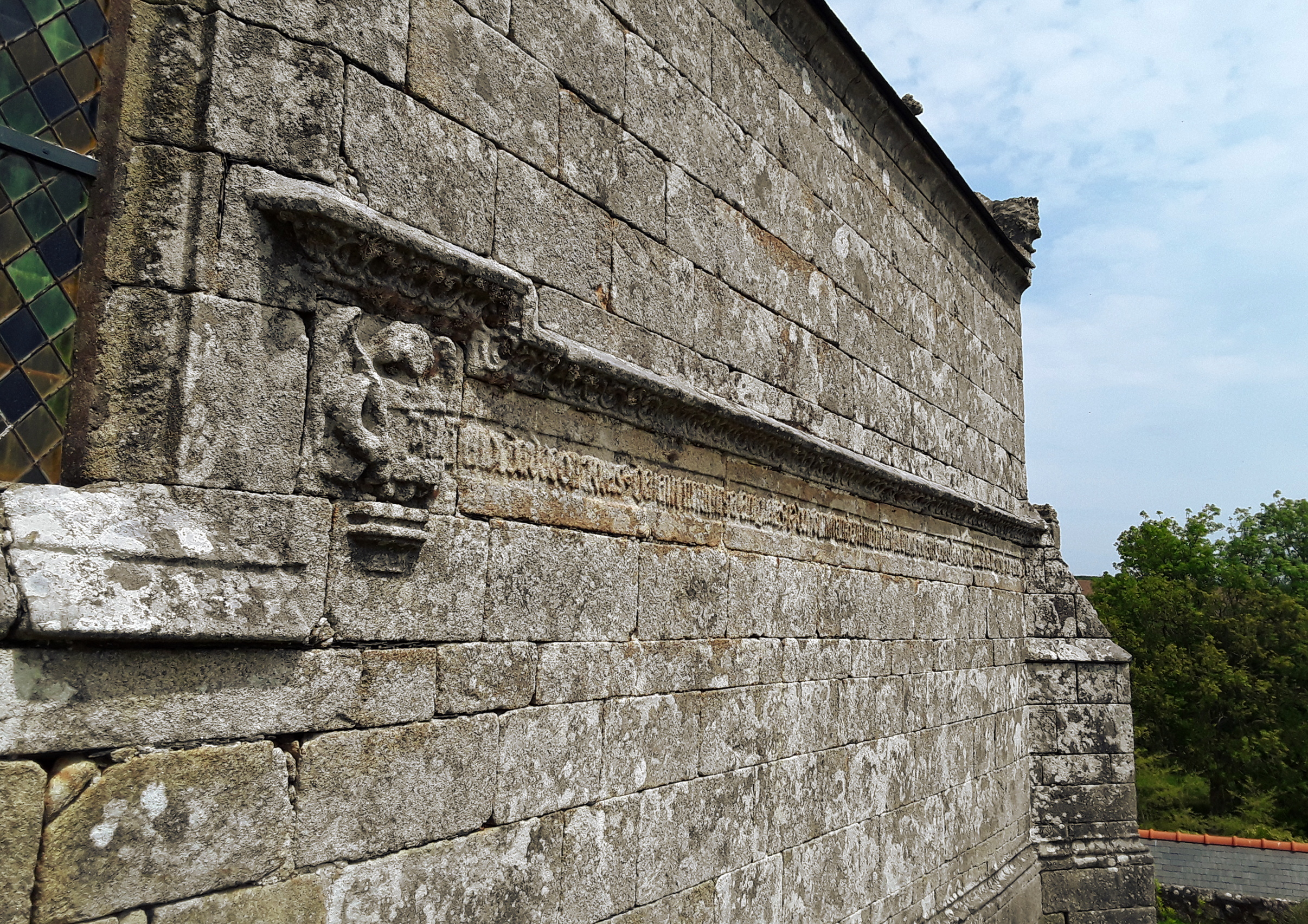 Façade sud, ange porte phylactère (2018).Immatriculation