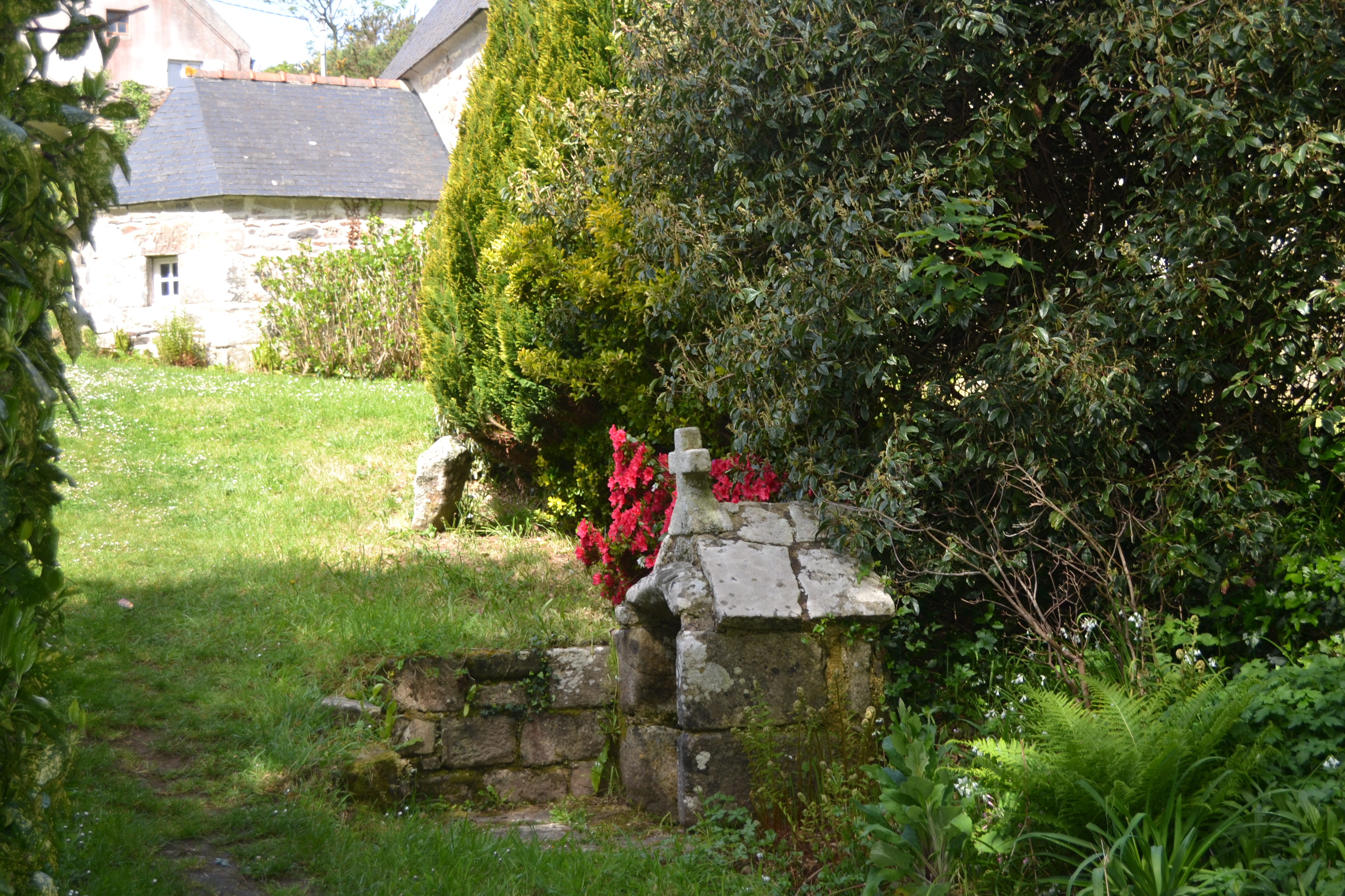Fontaine Saint-Tugdual, vue dans son environnement avec la chapelle en arrière-plan. (2018)Immatriculation