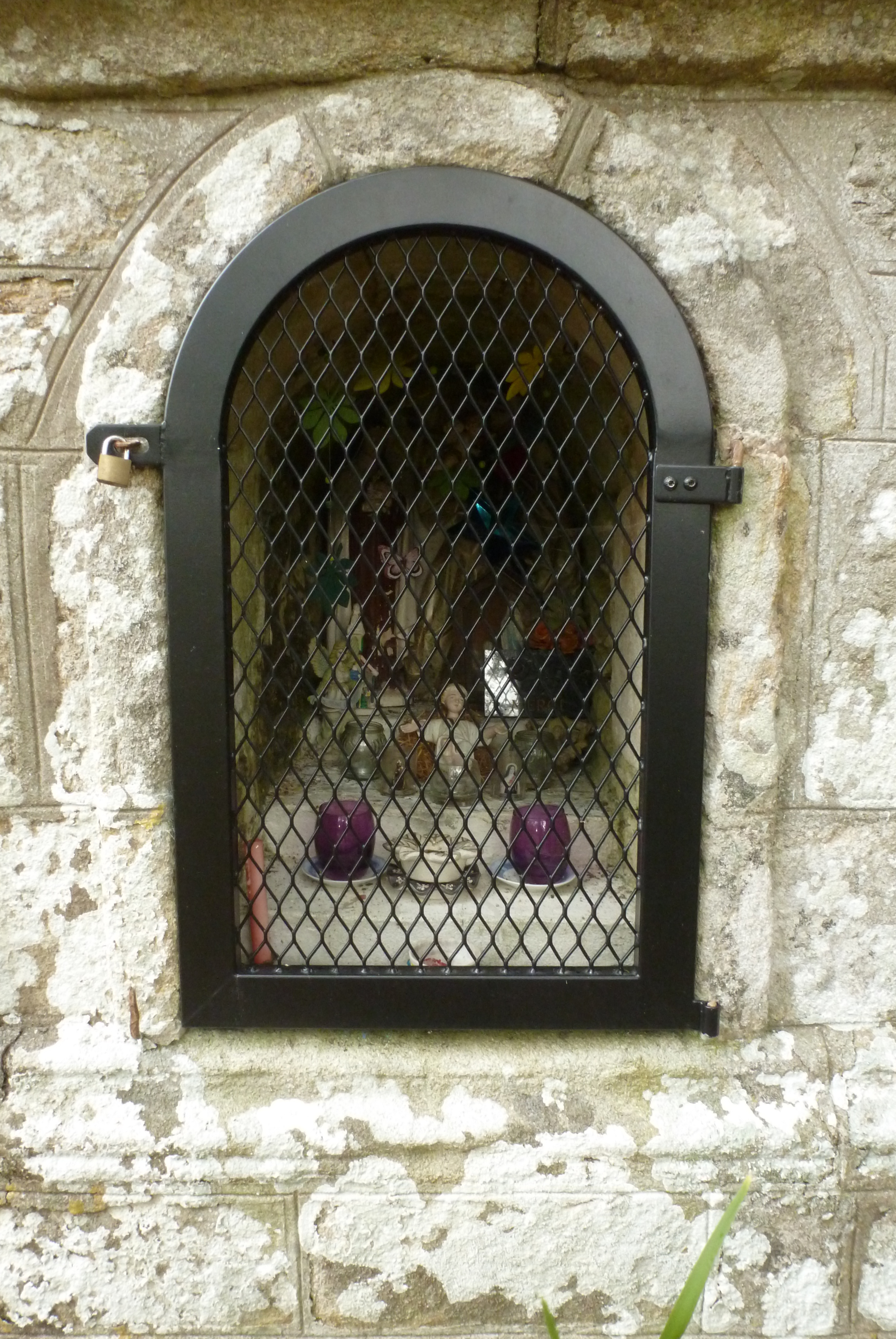 Détail de l'ouverture, côté sud, bougies et statuettes.Immatriculation