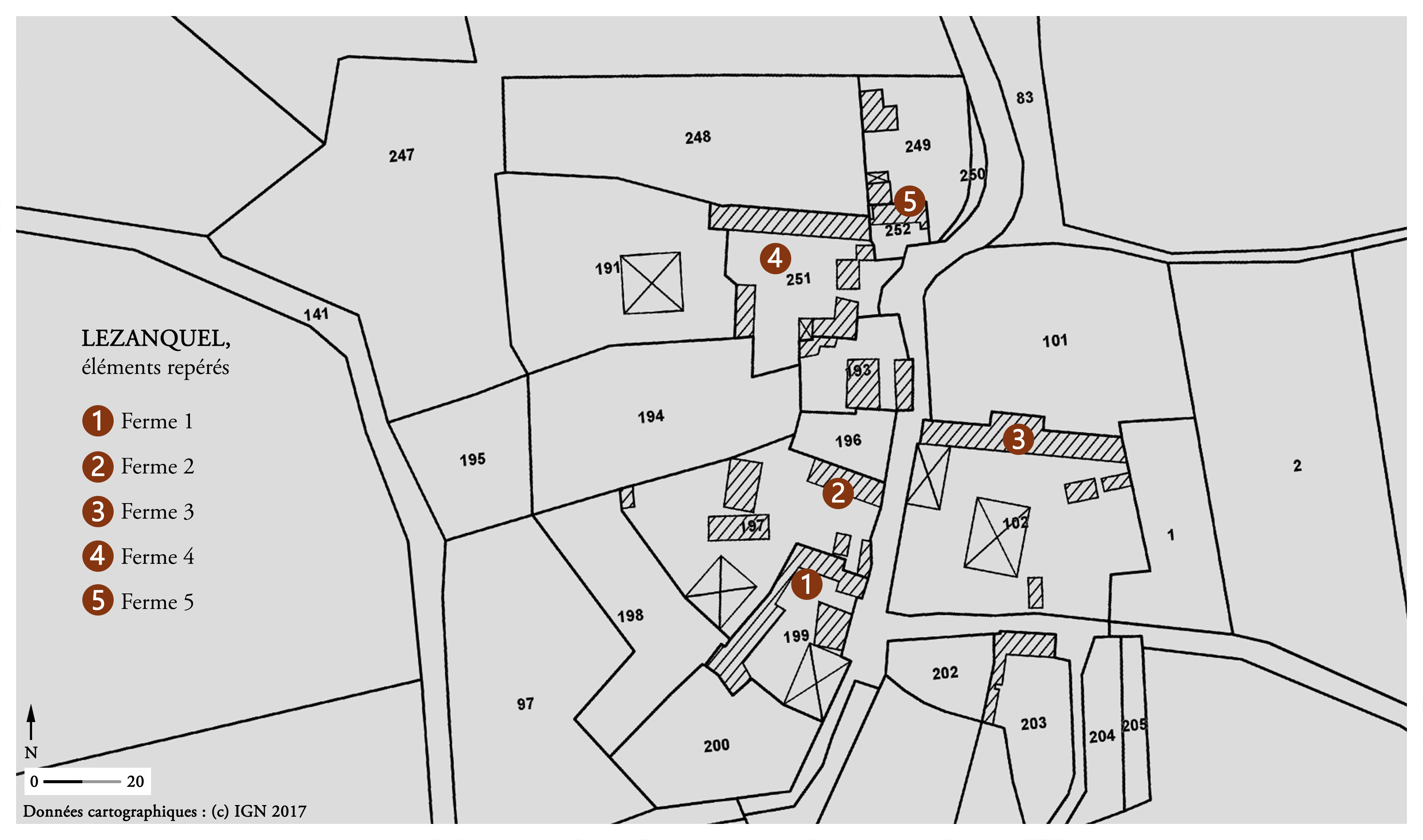 Village de Lezanquel, éléments repérés. Fond : cadastre 2017.Immatriculation