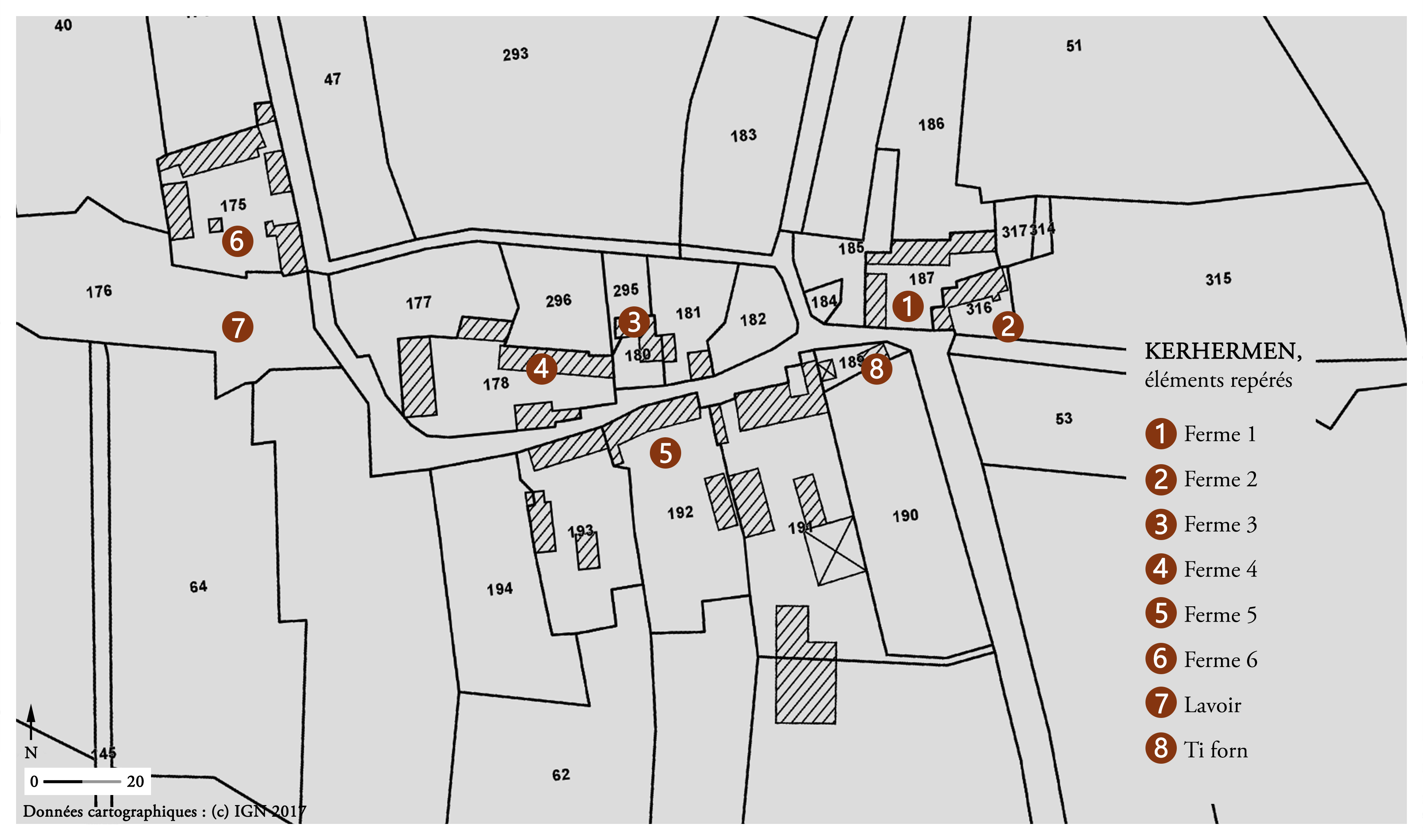 Village de Kerhermen, éléments repérés. Fond cadastre 2017Immatriculation