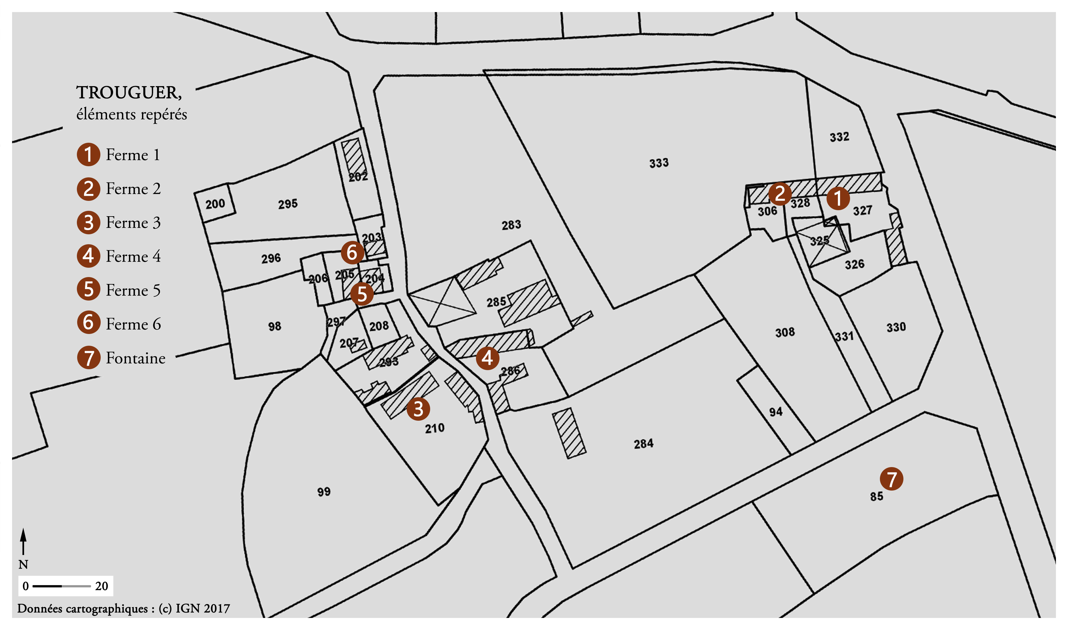 Village de Trouguer, éléments repérés. Fond : cadastre 2017.Immatriculation