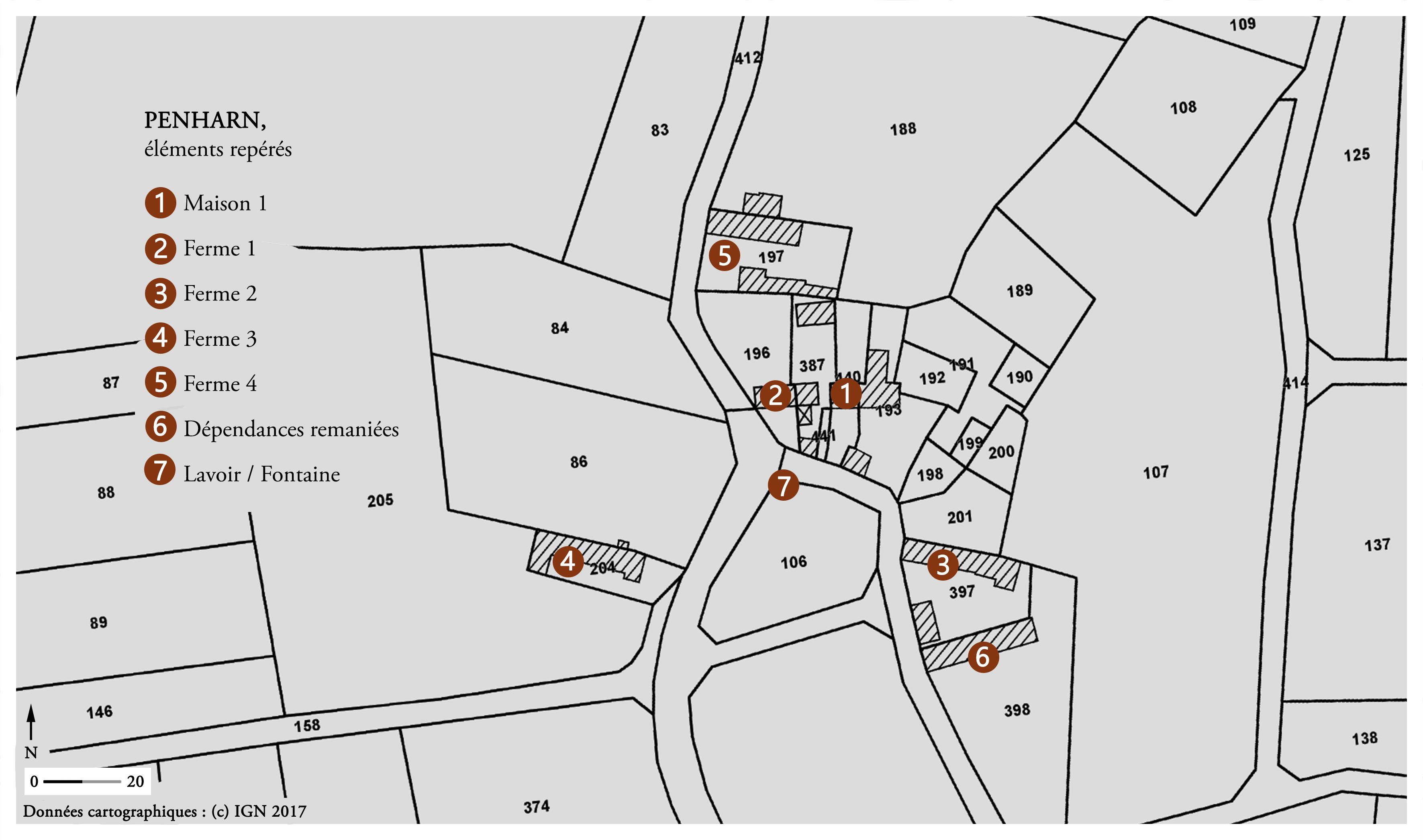 Village de Penharn, éléments repérés. Fond : cadastre 2017.Immatriculation