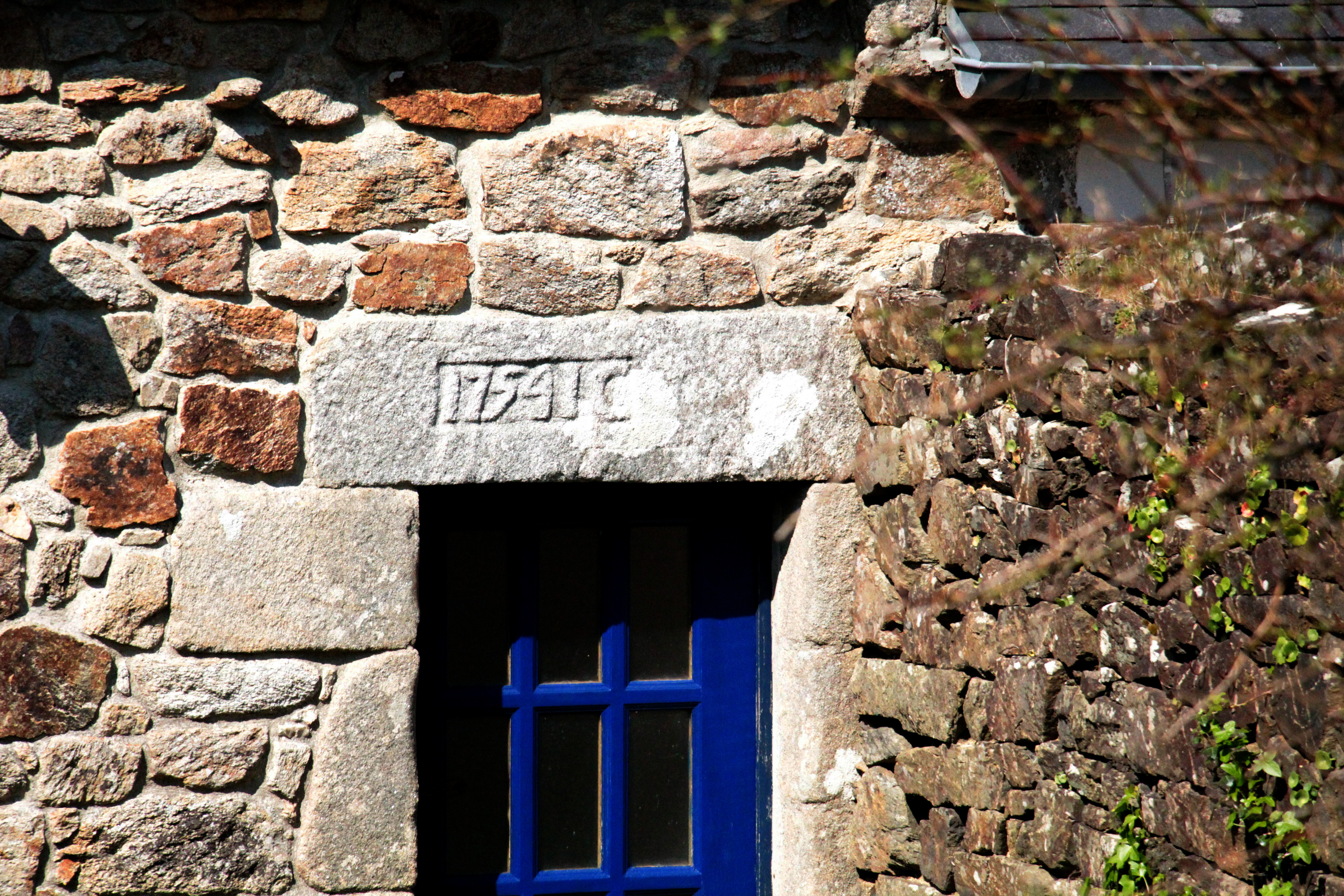 Elévation antérieure, linteau de la porte d'entrée et inscription "1754 IC". (2018)Immatriculation