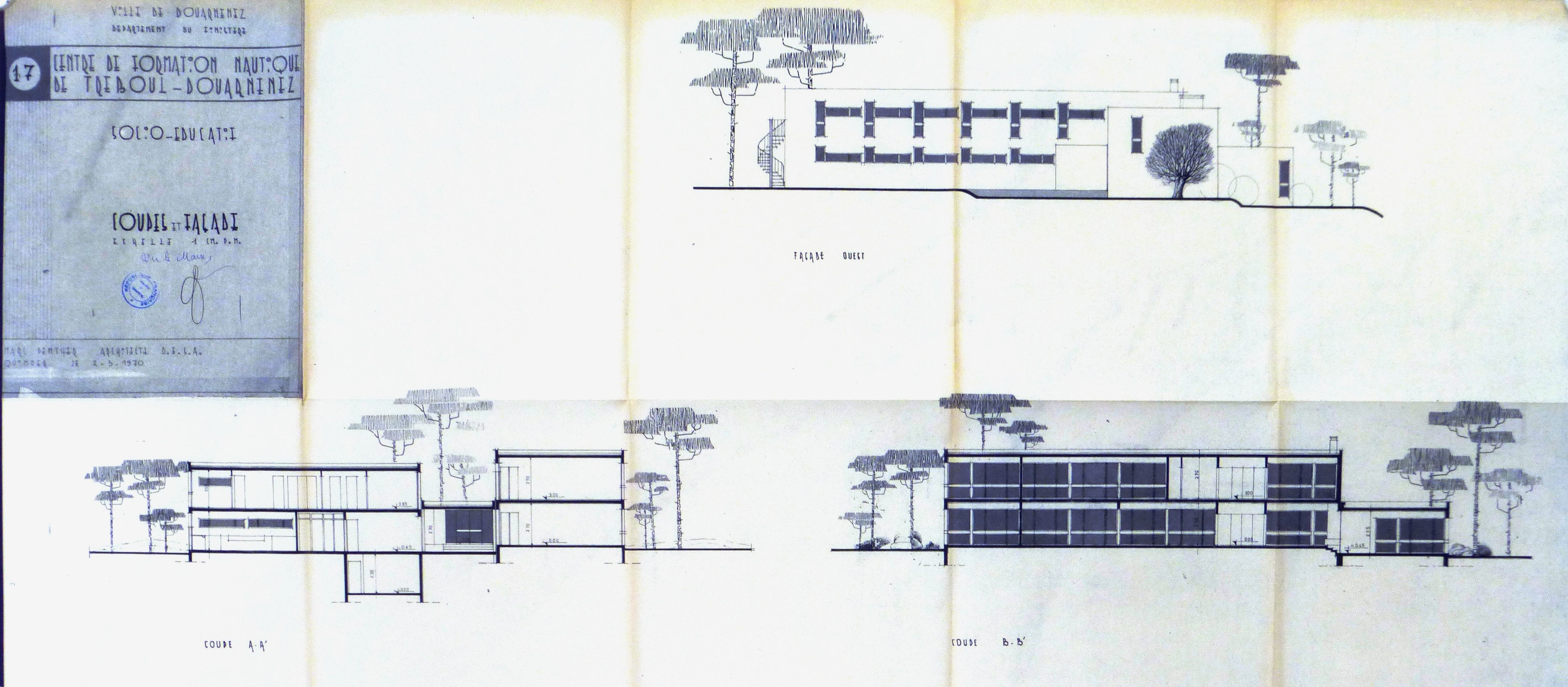 AN : 19790547/99. Bâtiment socio-culturel : coupes et façade ouest. M. Penther, 1970.