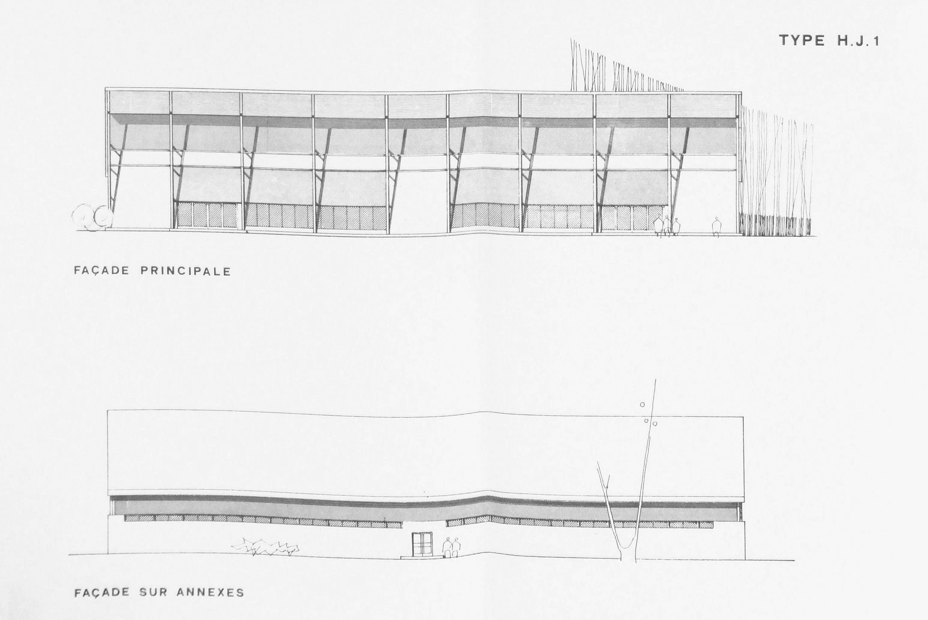 AC Rennes : 31 W 74. façade principale et façade sur annexes. L. Miquel & A. Wogenscky, 1965.