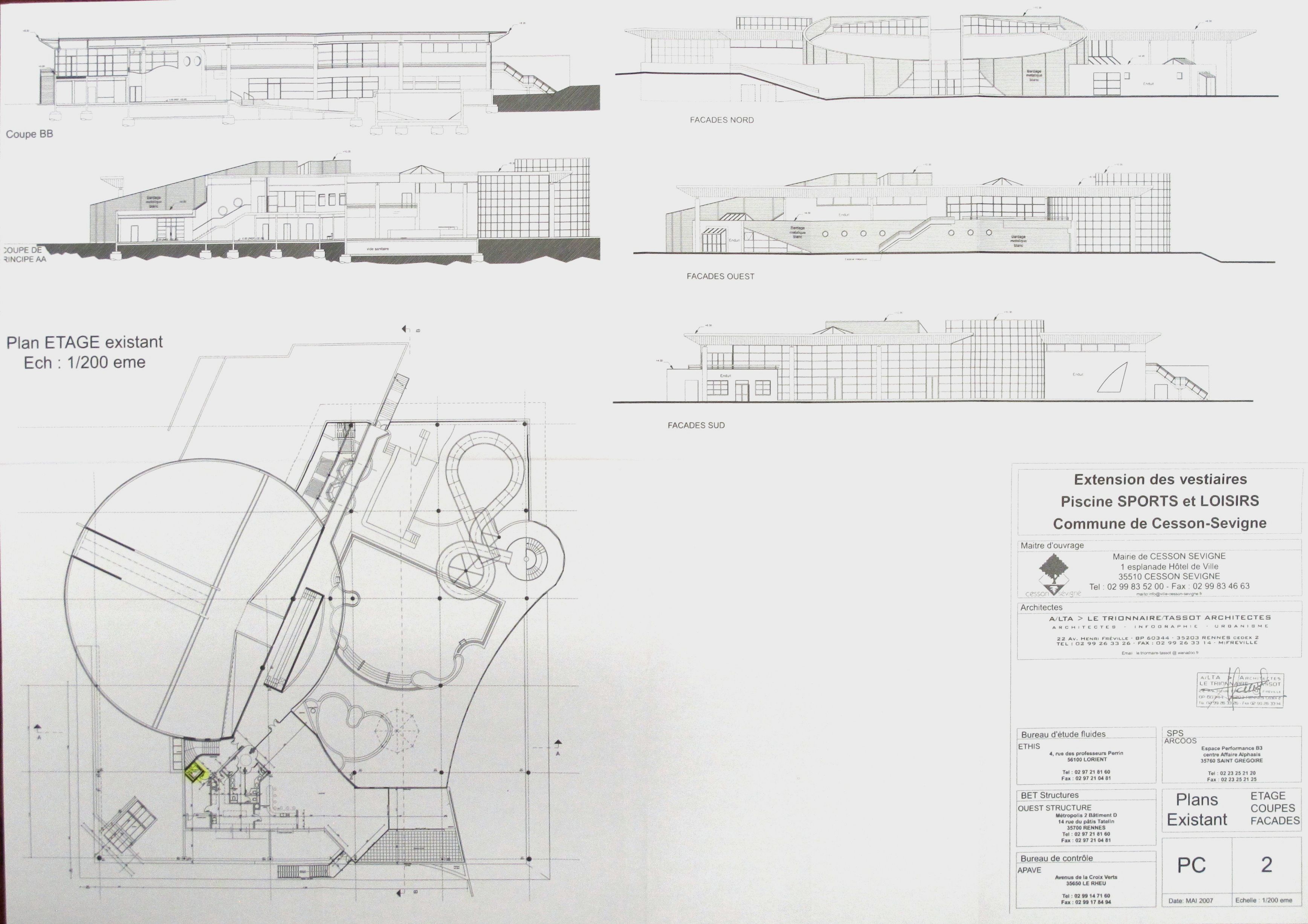 AC Cesson-Sévigné : PC n° 03505107A1031. Plans existant : étage, coupes, façades. A. Tassot & J.-L. Le Trionnaire, 2007.
