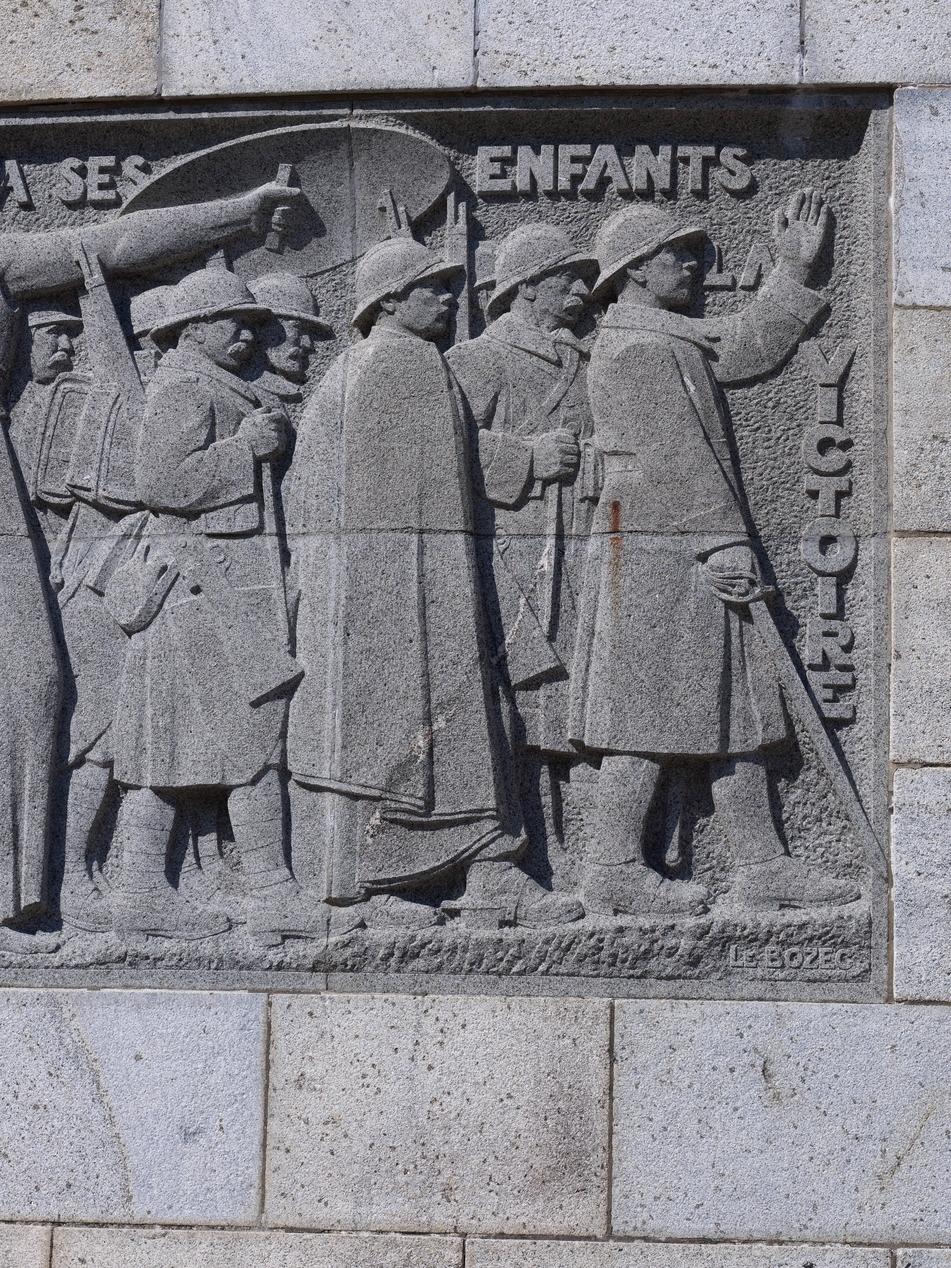 Bas-reliefs réalisés par le sculpteur Jules-Charles Le Bozec de Mellionnec (vue rapprochée).Immatriculation
