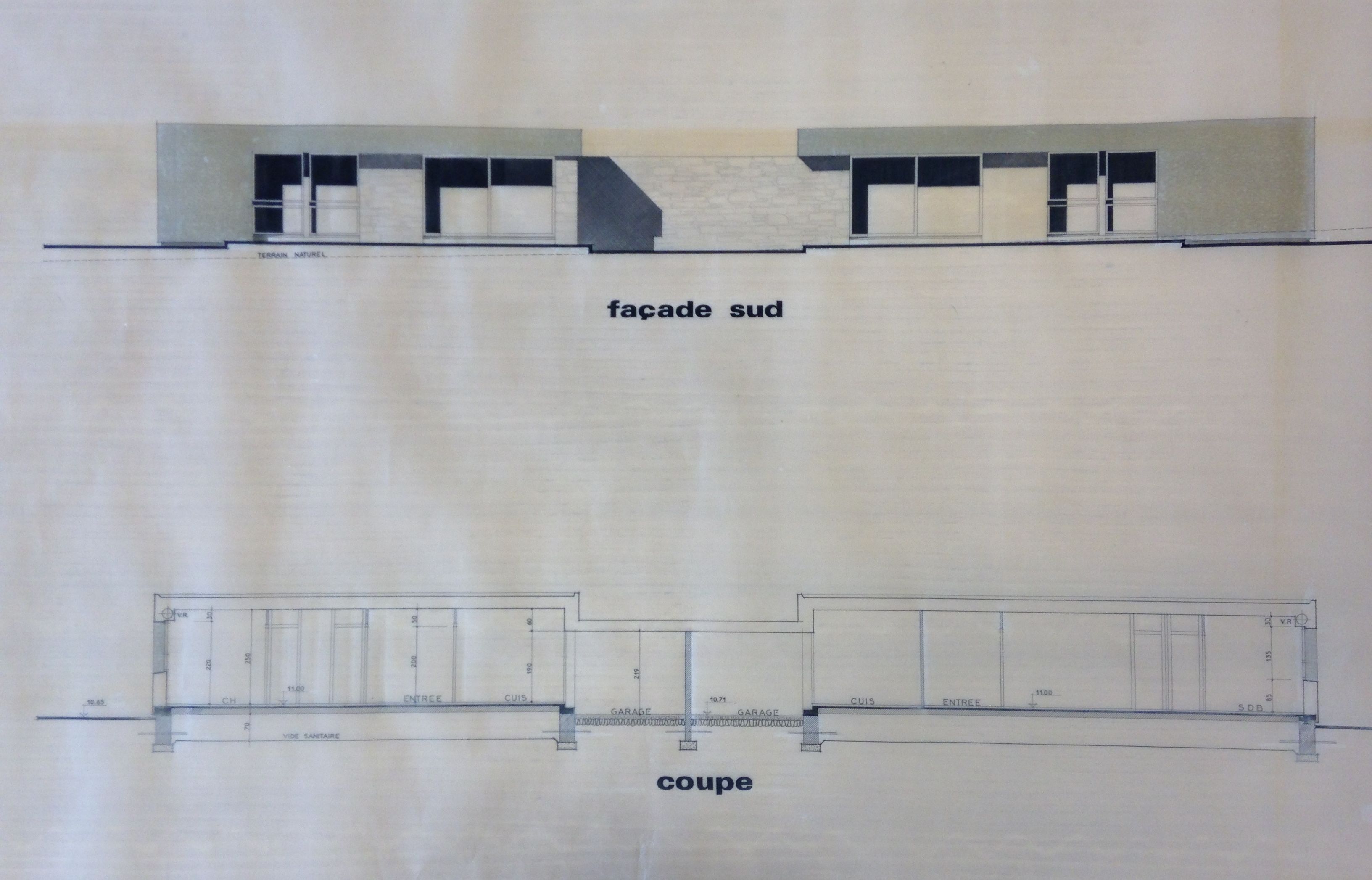 AD Morbihan : 110 J 127. Logements : façade sud et coupe. Y. Guillou, 1969.
