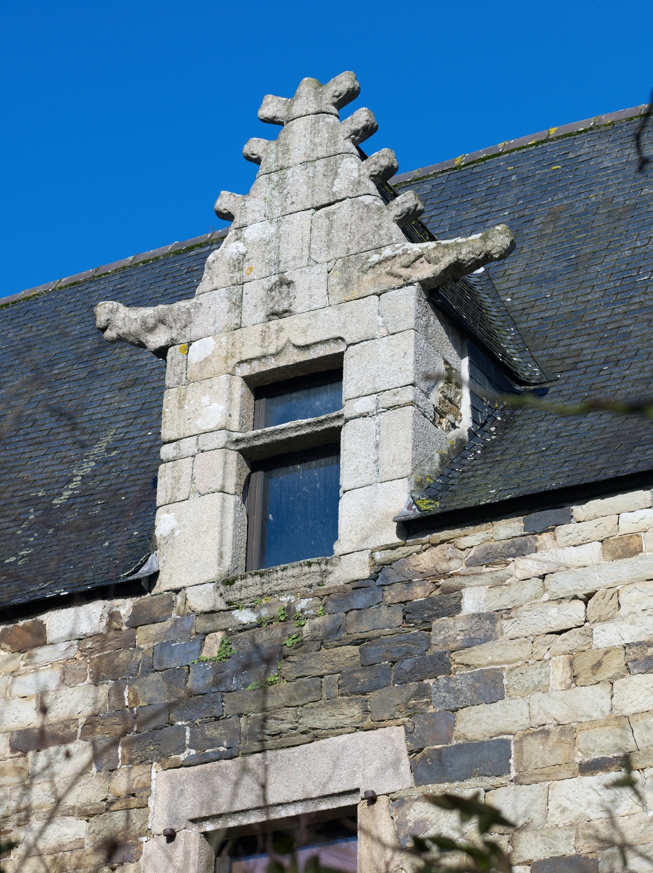 Minihy-Tréguier : manoir de Saint-Renaud, façade sud, détail de la lucarne à gable aigu de style gothique flanquée de crossettes sculptéesImmatriculation
