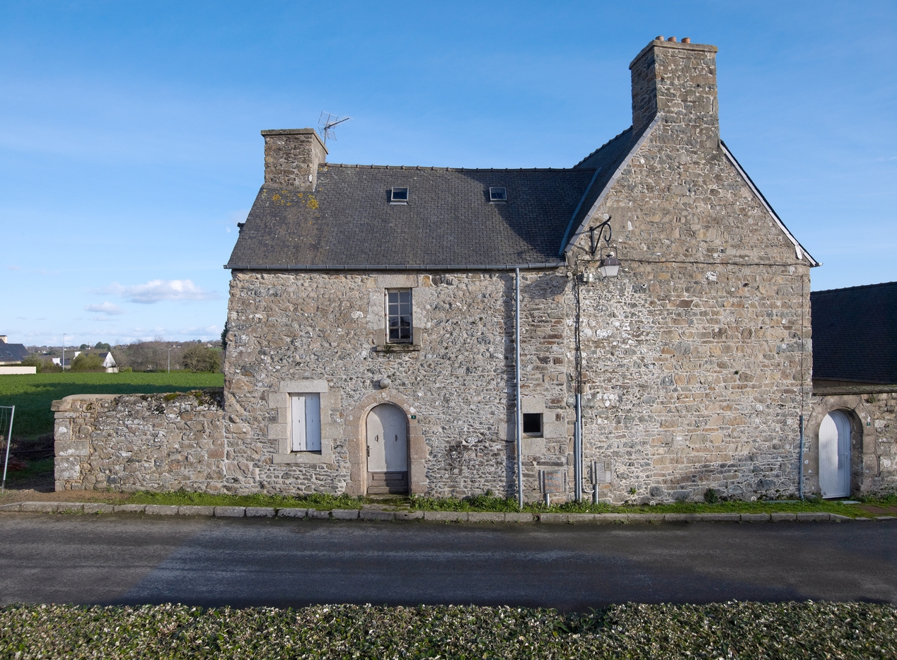 Minihy-Tréguier, 9 rue du Bourg : ensemble bâti, vue générale depuis l'ouest, élévation ouest du logis secondaire/arrière (porte en arc plein cintre) et pignon du logis principalImmatriculation