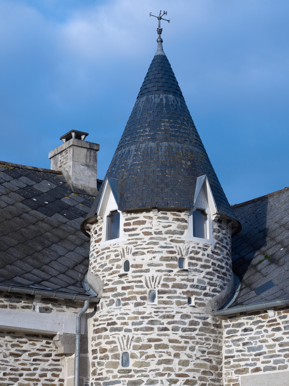 Minihy-Tréguier, Crec'h an Goué : grange-remise avec logements attenant, détail de la tour pigeonnier couverte en poivrièreImmatriculation