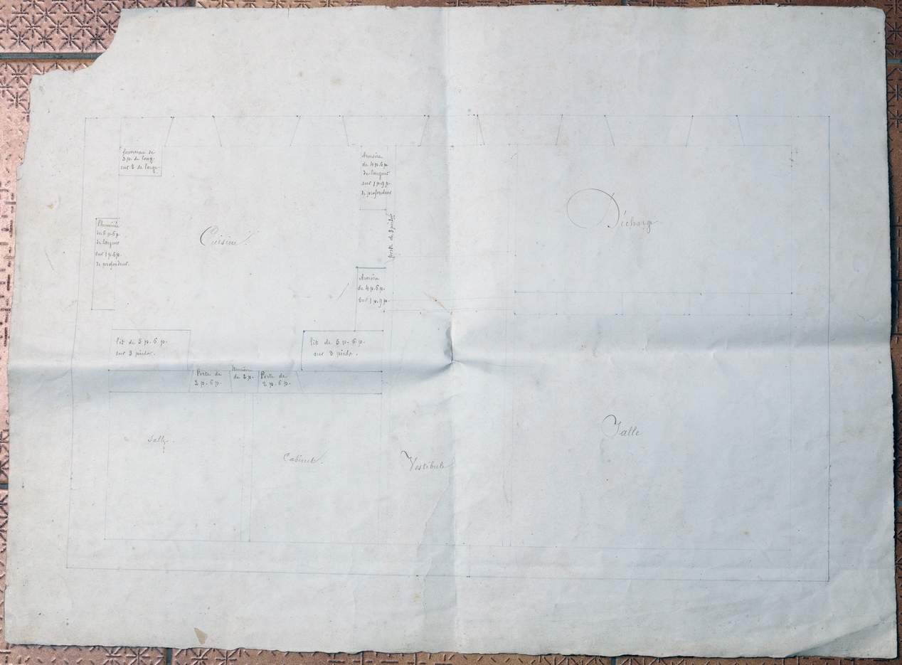 Minihy-Tréguier, Crec'h an Goué : plan au sol du logis et des meubles de la cuisine (collection particulière)Immatriculation