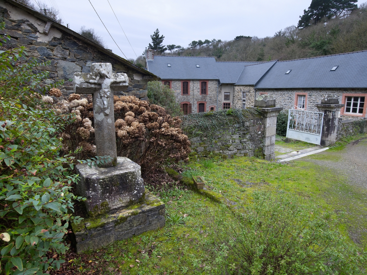Minihy-Tréguier, le Guindy : le Moulin du Pont, vue de situation depuis l'est. Au premier plan, la croix de chemin du Guindy (remontage)Immatriculation