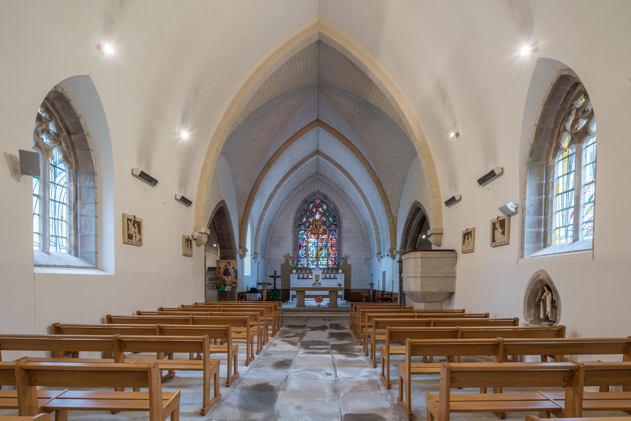 Vue intérieure : la nef est éclairée par deux grandes baies gothiquesImmatriculation