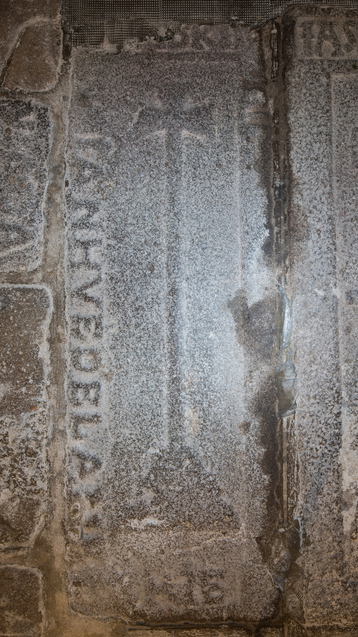 Pierre tombale du choeur : J(E)AN HUE DE LA (NOE)...Immatriculation