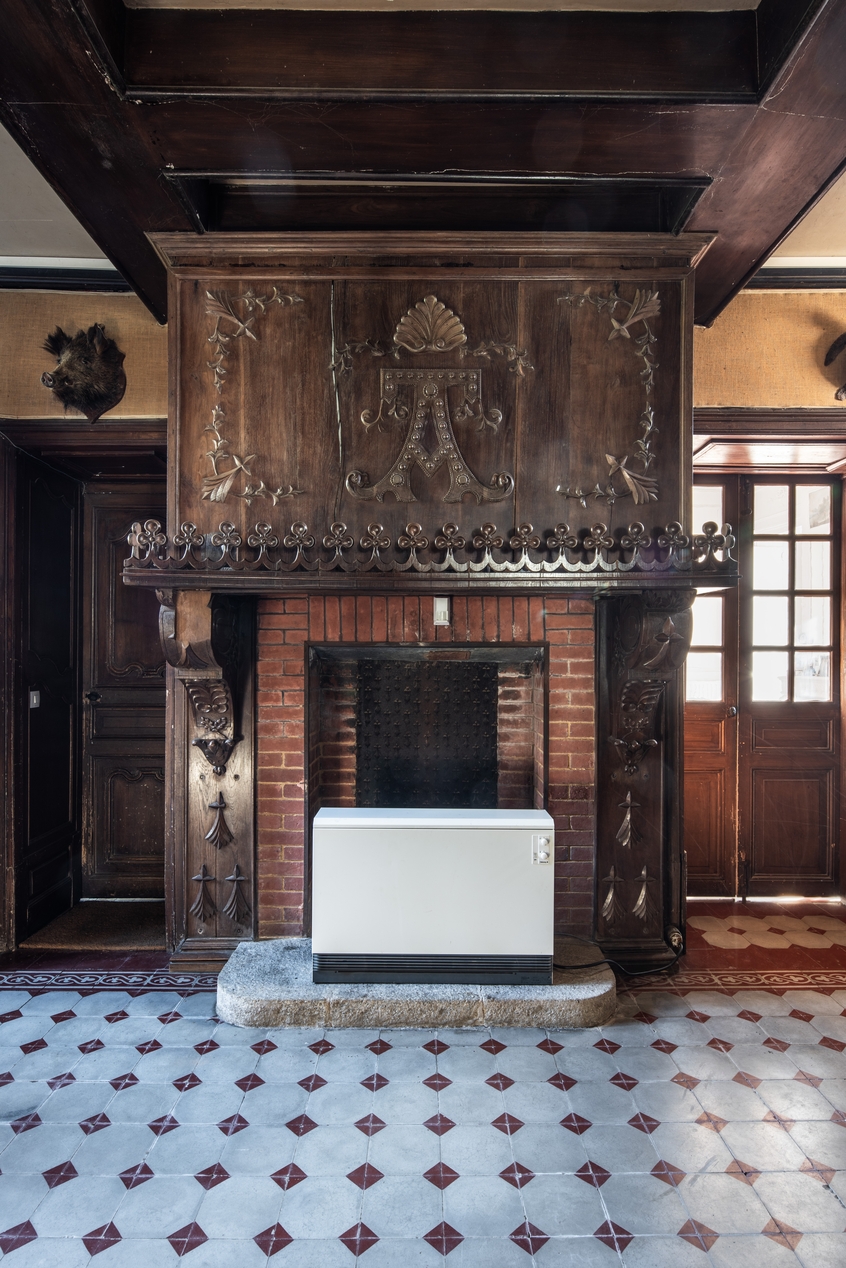 Ancienne salle transformée en hall avec cheminée en menuiserieImmatriculation