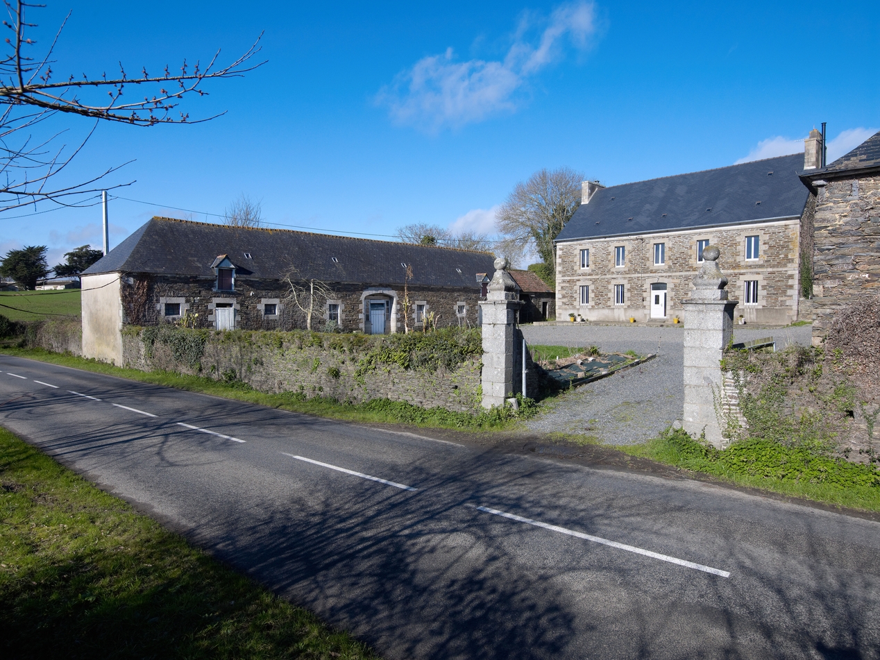 Langoat : ferme de Kermenguy. Le logis est daté 1836 (date portée). Les grandes étables à chevaux et à vaches sont construites perpendiculairement au logis, de part et d’autre de la courImmatriculation