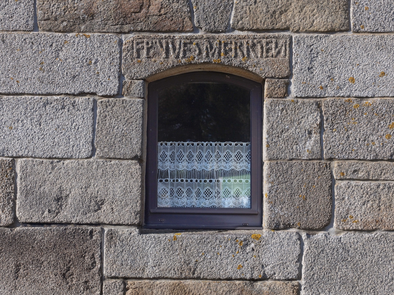 Vue de détail de la fenêtre est du rez-de-chaussée du logis : inscription "F [fait] P [pour] YVES MERRYEN" sur le linteau en arc segmentaireImmatriculation