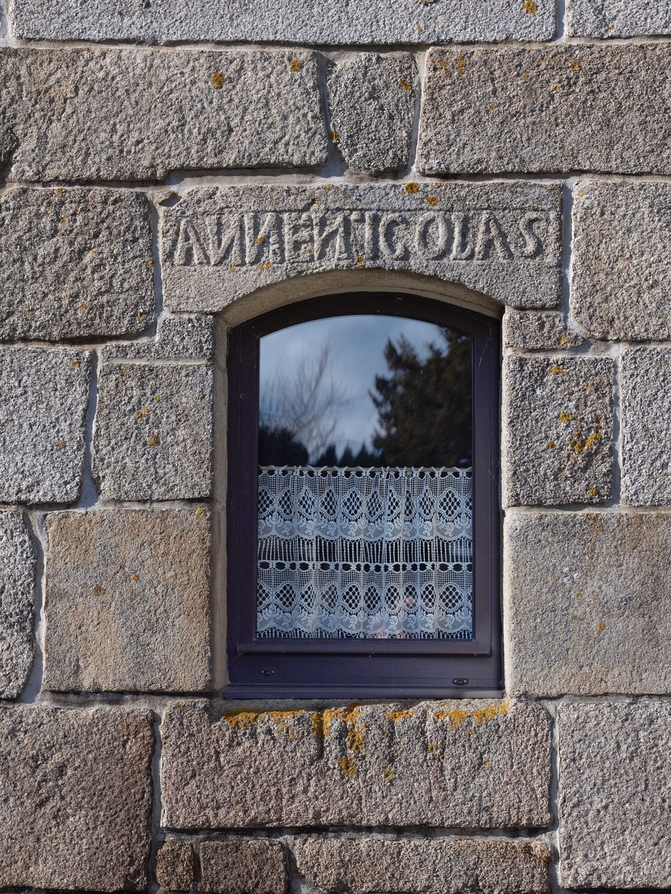 Vue de détail de la fenêtre ouest du rez-de-chaussée du logis : inscription "ANNE NICOLAS" sur le linteau en arc segmentaireImmatriculation