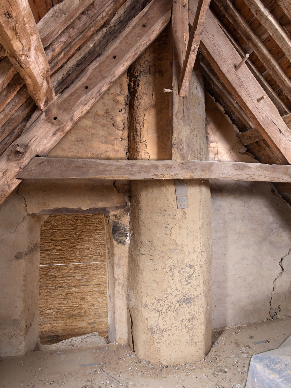 Minihy-Tréguier : manoir de Traou Martin, partie ouest, détail de la charpente et du conduit de cheminéeImmatriculation